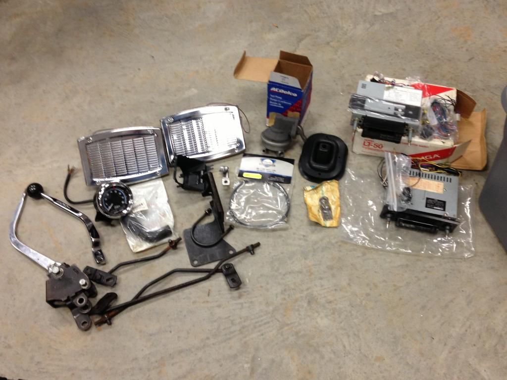 Shifter Crankcase vent hose Fuel line bracket Tach Dash pad clip Radios Speakers Spare shifter handle Shifter boot |