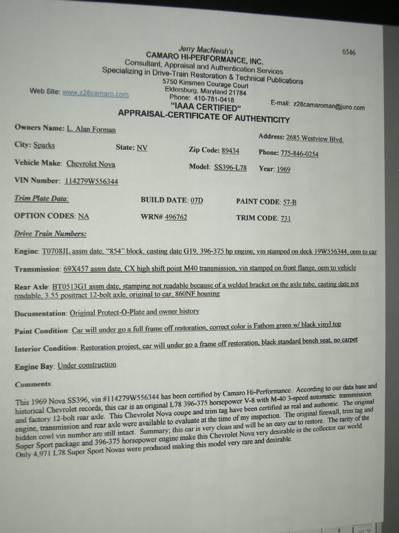 Re: 1969 nova SS L-78 for sale / original drive train