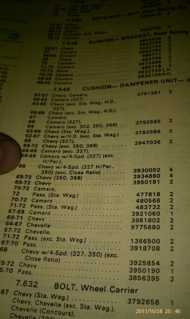 Ok i can't make heads or tales of my gm parts book notes ..What would the correct part / # be for a multi leaf rear spring cushion for a 67-69 Camaros /Nova like copo /z28/zl1/l78 and 69 Trans AM etc ? Would a 4 speed and auto take the same numbers upper/ lower ..Let say its a 69 4 speed 325 hp 69 camaro pace car .http://i263.photobucket.com/albums/i...6/IMAG0607.jpghttp://i263.photobucket.com/albums/i...6/IMAG0609.jpghttp://i263.photobucket.com/albums/i...6/IMAG0608.jpg