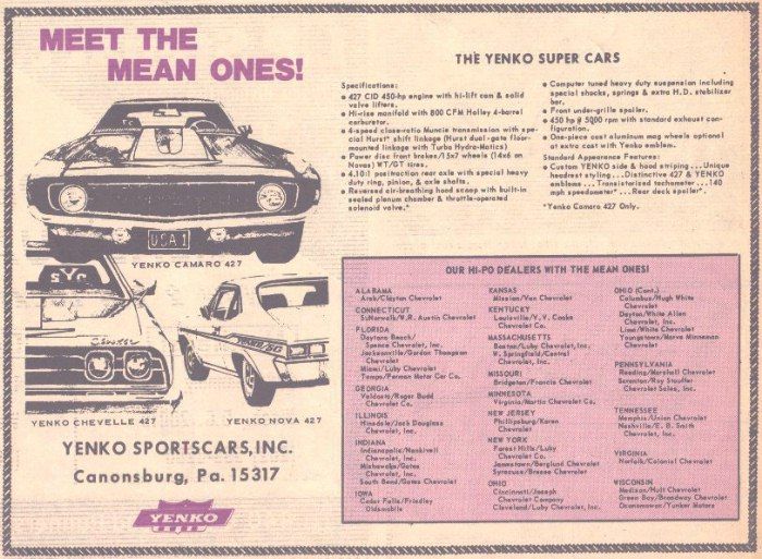 The really nice one was a Yenko Dealer hand/mail out -that one is hard to find. there were different ones printed in the magazines also. There is a half page B&W one in Super Stock Aug 1969. The magazine with the Yenko Chevelle road test. |