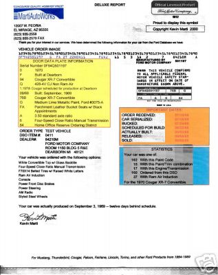 The car is 1 of 17 428 Cobra Jet 4 Speeds convertibles made, and 1 of only 4 with the Ram Air option and a 4 speed. The really cool part is this is the 1st Built (ordered in July of 69') and a Factory Test car sold new back to Ford R&E. When the car was found it had factory air conditioning which isn't listed on the Marti report but the guy who owned and restored the car swears that when he got the car it was original and never restored and had the cut outs where the air would have went along with the condenser still in place and the Air controls and venting in the dash which he said you could tell had never been touched. The car also is listed with 3.50 gears on the Marti report and when the car was found it had 3.00 and the only way you could get factory air was to have 3.00 rear gears in 1970. Being a factory Test car and being such an early car the story all makes sense to me and the owner/restorer is a knowledgeable well respected Cougar guy but Id love just to have some concrete evidence. Being 1 of 4 is already rare enough for me and it could possibly be the only surviving example but it would be 1 of 1 if I could prove the air conditioning.