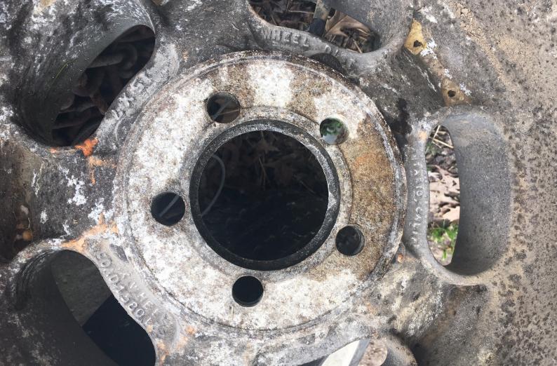 On the backside starting at 12:00 position it says, "wheel dist.", 3:00, "Ontario Calif.", 7:00, "max wheel load 1580lbs", 10:00, "15X7".
