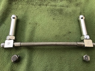 ---aftermarket holley dual feed fuel line. This has two different sizes, you can block off one or the other, comes with two plugs for large feed or small feed. New never been used. 35$