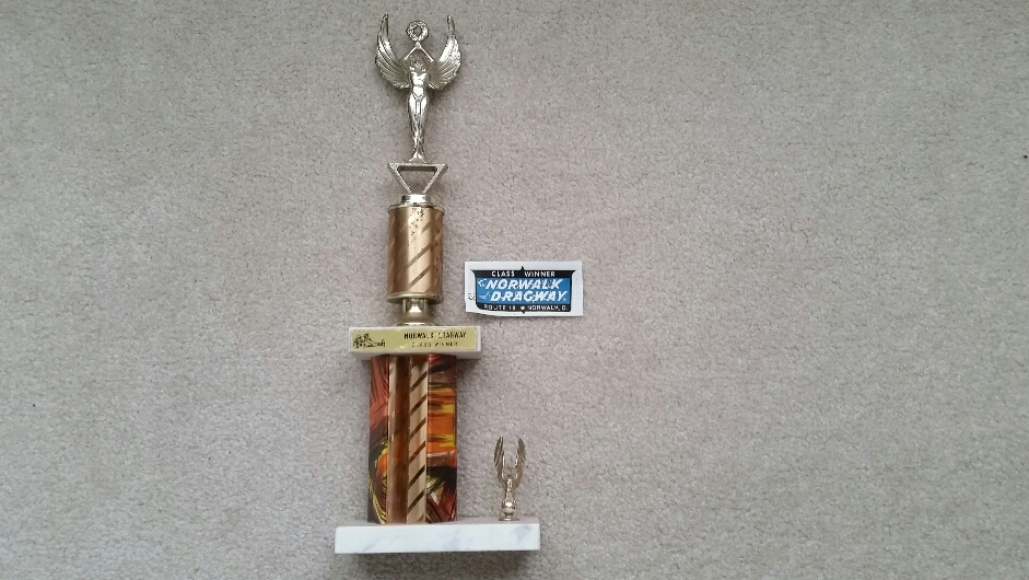 Hence the Day 2 craze, Here I have an old 60s or 70s vintage Norwalk Raceway class winner trophy with a paper copy of an original water slide class winner window decal.