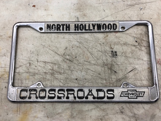 Here's a rare find. Early take off, card stock dealer plates from Crossroads Chevrolet in North Hollywood. There was some muscle that came from this dealer back in the day. These are in real nice shape and each plate still has 2 holes plugged. No torn holes. There's some marks/scrapes in the design probably from hanging in a garage for a bunch of years. $80/pr, ride included, PPFF.