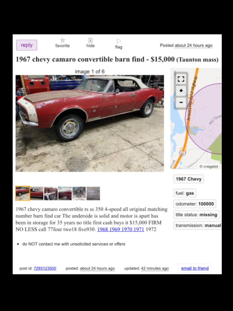 1967 Camaro conv 15k Boston Craigslist