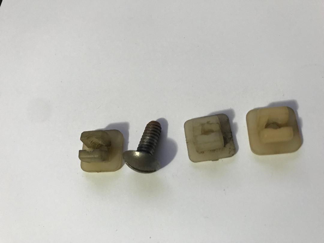 A handful of Nice Original factory license plate screws and their square plastic nuts.