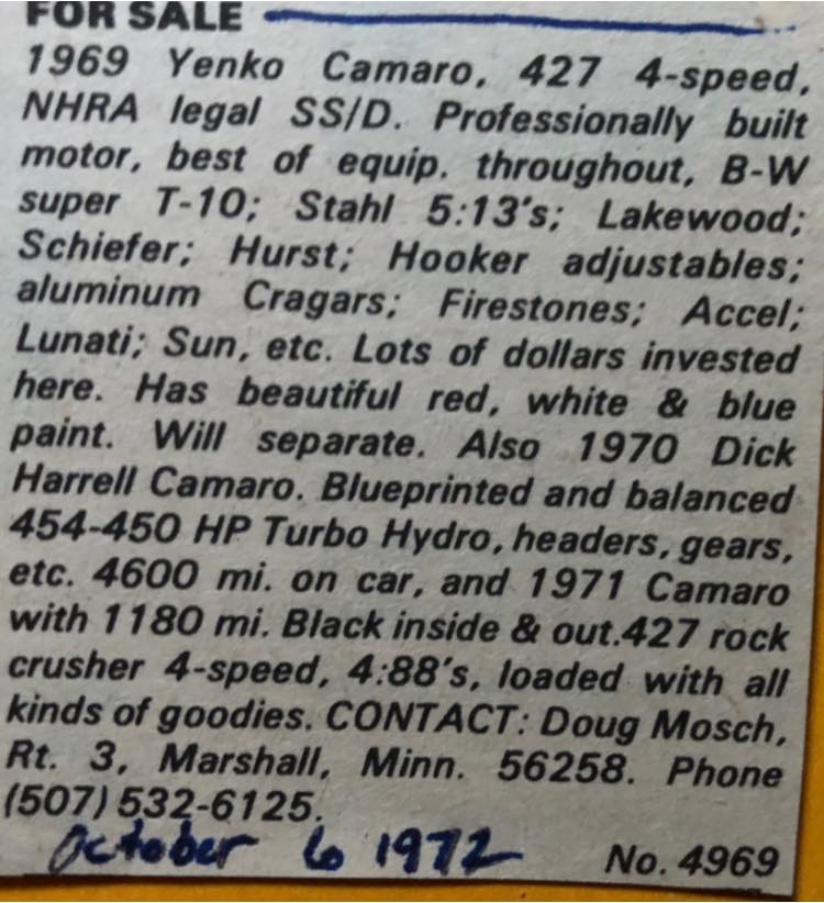 The car was originally sold in Iowa and raced from day one. It supposedly ended up with a small block and a 4 speed in the late 1970s, repainted solid orange, then disappeared. It's unknown if the Yenko badging stayed on it. The VIN isn't known but from the picture it's a Doug Mosch car.