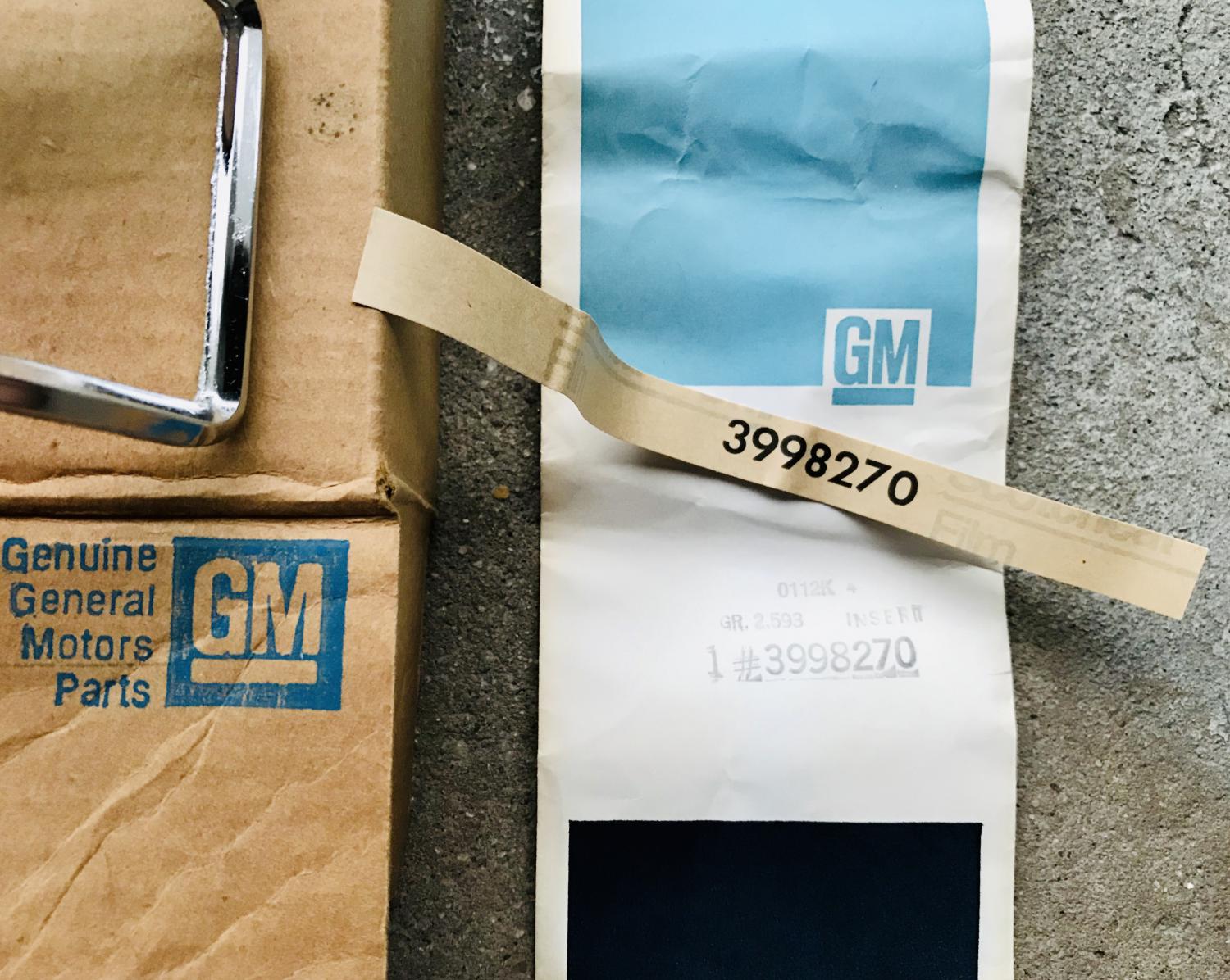1971 Chevelle NOS parking lamp bezels 3982488 RH & 3982487 LH. Each box comes with one 3998270 insert that get painted to match the car and then installed on the bezel. (SOLD)
