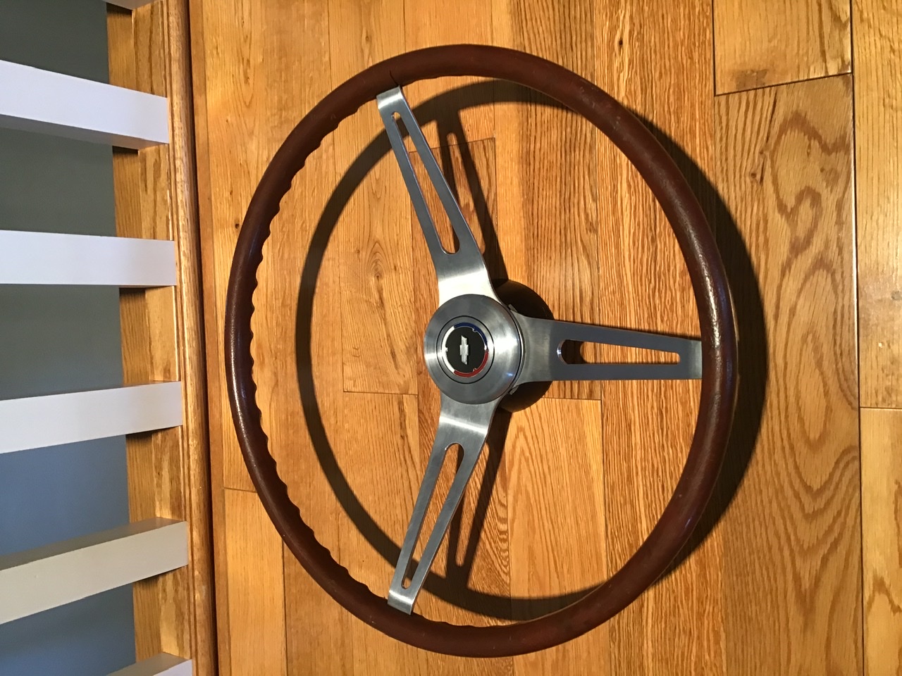 Used 1969 Chevrolet rosewood steering wheel. This wheel is not bent and has some grain and texture left. The color is nice with marbling. I would rate the wheel as a good driver. It has one crack at the 3 o’clock position. The hub, horn contact and steering wheel is genuine GM. The horn button is reproduction. It has nicks but nothing major I can see.Please look at the pictures and make your own judgement. $1100 plus shipping. Thanks Yenko.