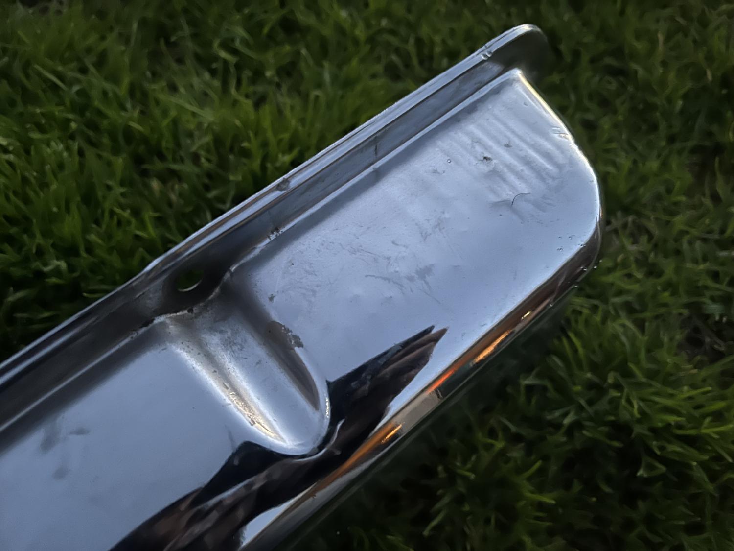 Chrome is very nice as shown with only a couple issues - a tiny dent from the inside poking through the chrome and a tiny area of flaking. Otherwise, typical GM quality flash chrome of the era. Plating is missing on the one where the two tabs were removed of course.
