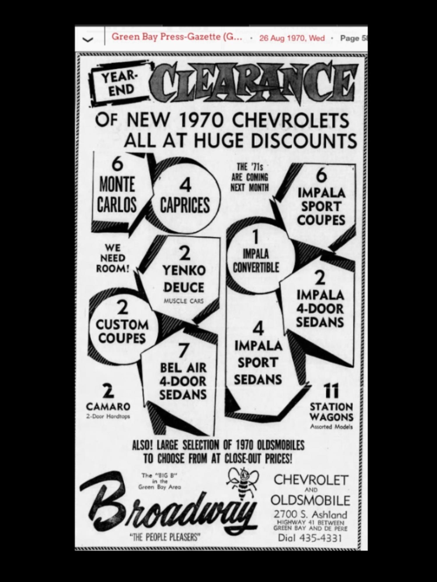Does anyone know where I can find/read ads from the early 70s from Broadway Chev in Green Bay, Wi? Thanks in advance for vectors ...