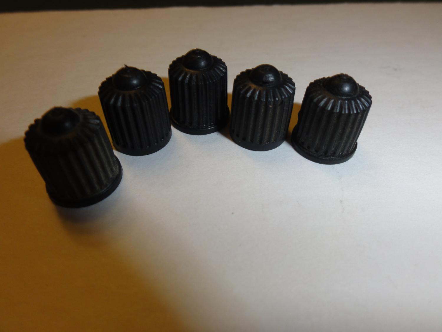 5 Schrader assembly line valve stem caps, ribbed knub top style . Found in an old closed down wheel alignment shop. Excellent condition .Multiple sets available ( 360.00 Free shipping lower 48 states).