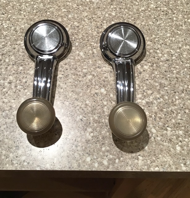 NOS GM in the boxes clear window crank handles. The chrome is nice and the rollers have good color unlike some. These fit various makes/models. Part numbers are 20037597. The clips are on the handles as well. $165.00 plus shipping. Thanks