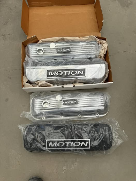 Prototypes. Made for Joel Rosen and Motion Performance for BBC with stud girdles and roller rockers by Anker. Finned set complete and ready to go. Other set needs to have machining complete or make a nice wall hanging. Note the HUGE difference in size of the Motion Emblem. Both come in boxes addressed to Joel Rosen. Will supply COA if necessary. Open to reasonable offers.