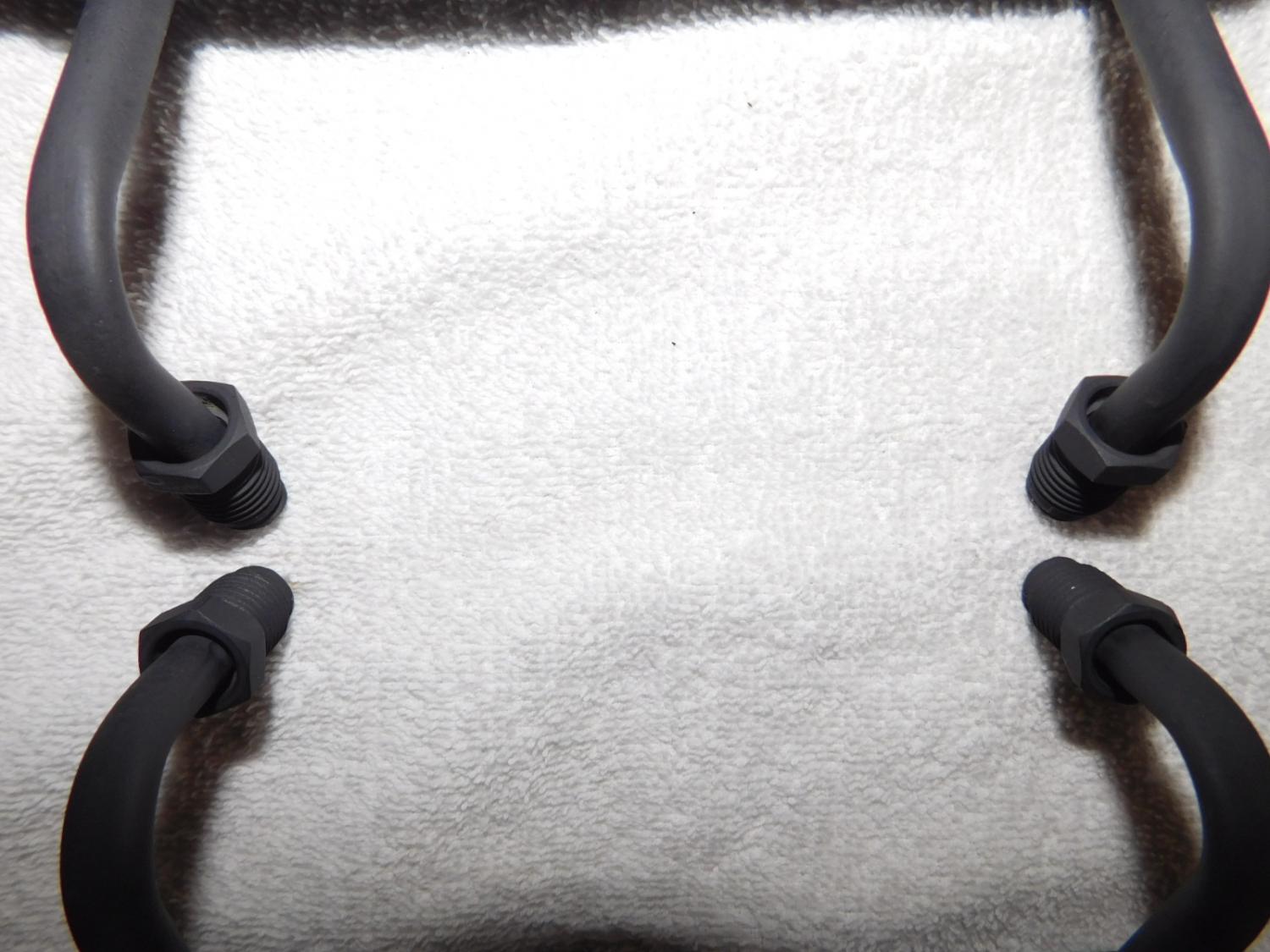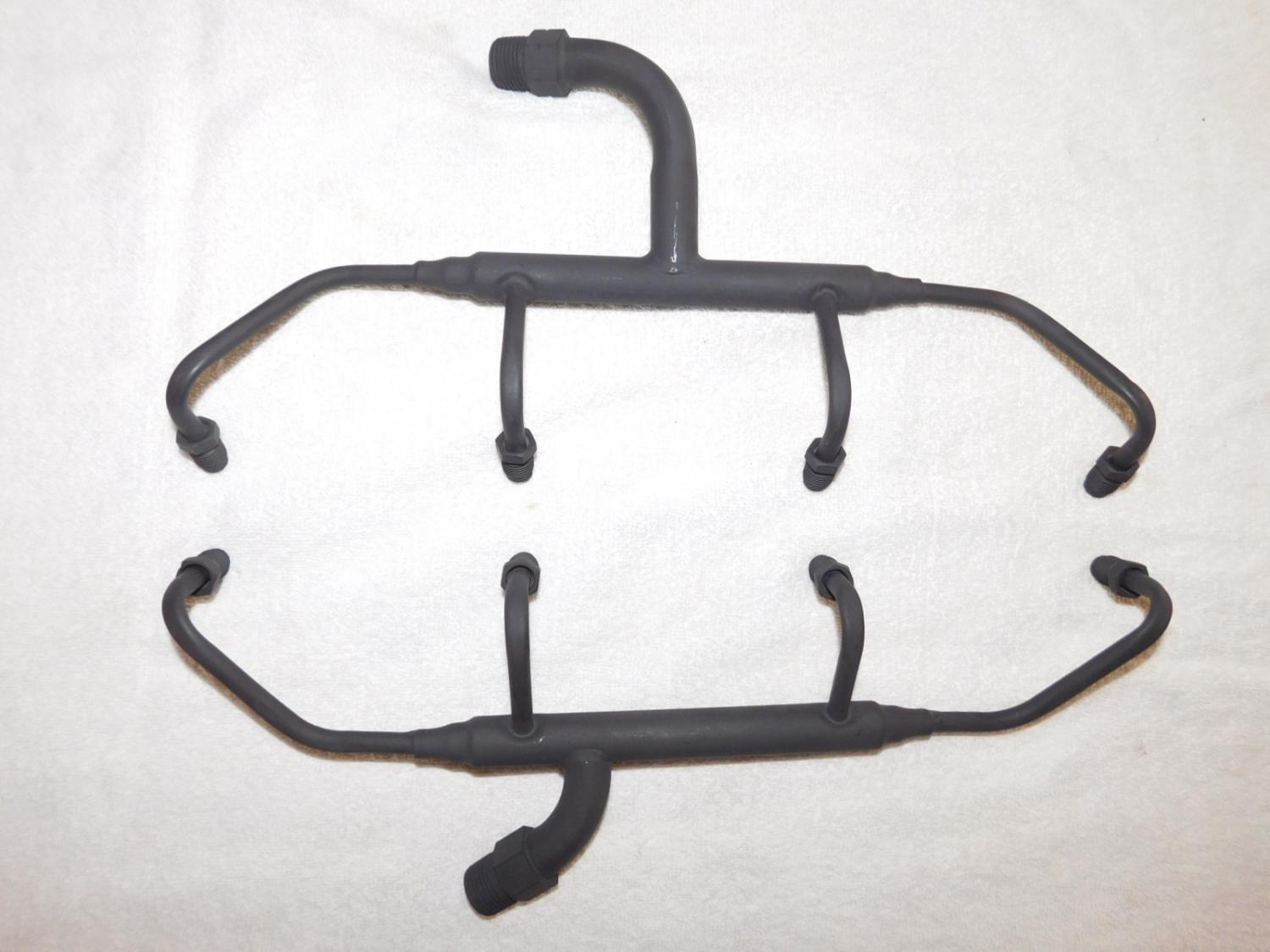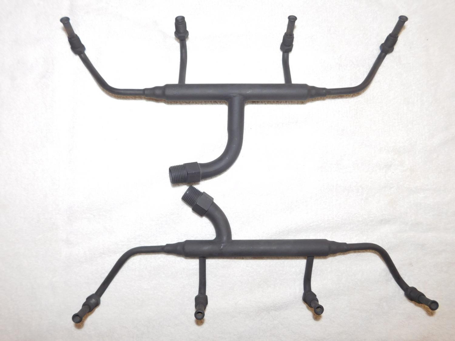 Original Corvette 427 air injection/smog tubes. These are the earlier variation with the smooth transition from the large pipe to the small pipe. All threads and nuts are good. These can be used on 427 and 454 engines. The left side pipe was also used on other GM BB engines.
