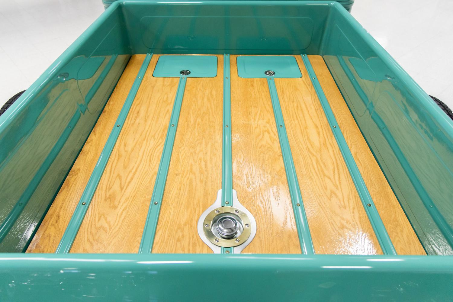 The exterior of this truck is eye catching with its one-of-a-kind design and gorgeous color. The original cab was stripped to an empty bare metal shell and chopped 2”. The custom metal nose and grille, metal 4-piece hood and metal side covers were fabricated from scratch. The nose incorporates a lower center driving light and lower vents. The side covers were designed with stylish vents. The entire one-piece rear bed was also fabricated from scratch. The bed was designed with stylish fenders which include molded taillights. The bed was also designed to incorporate the rear bumper. The entire body is very straight with excellent panel fitment throughout. The hood and doors close very nicely. It was painted in the beautiful shade of Green which dresses it perfectly. The show quality paint was recently detailed to a brilliant shine. The new 2-piece tinted front windshield with new seals opens forward as it was originally designed. It also has new tinted side glass and rear glass which is crystal clear. Some of the exterior custom features include dual chrome mirrors, nose ornament, painted headlight buckets with Sylvania Halogen headlights, vintage door handles, 1937 Ford taillights, third brake light, SO-CAL lenses, wood bed floor with painted slats, two rear bed storage compartments with power cutoff knob, rear bed fuel filler and chrome rear bumper with exhaust outlets. The truck has a killer stance on Artillery style black steel wheels with green stripe and chrome hub caps. The 15” front wheels are mounted to Falken Sincera 195/65/15 tires and the 17” rear wheels are mounted to Excelsior Stahl Sport radial 7.00/7.50/17 tires. It's equipped with a Class III hitch which is concealed behind the removable license plate bracket. Everything on the exterior is in working order such as the headlights, turn signals, tail lights, brake lights and horn.