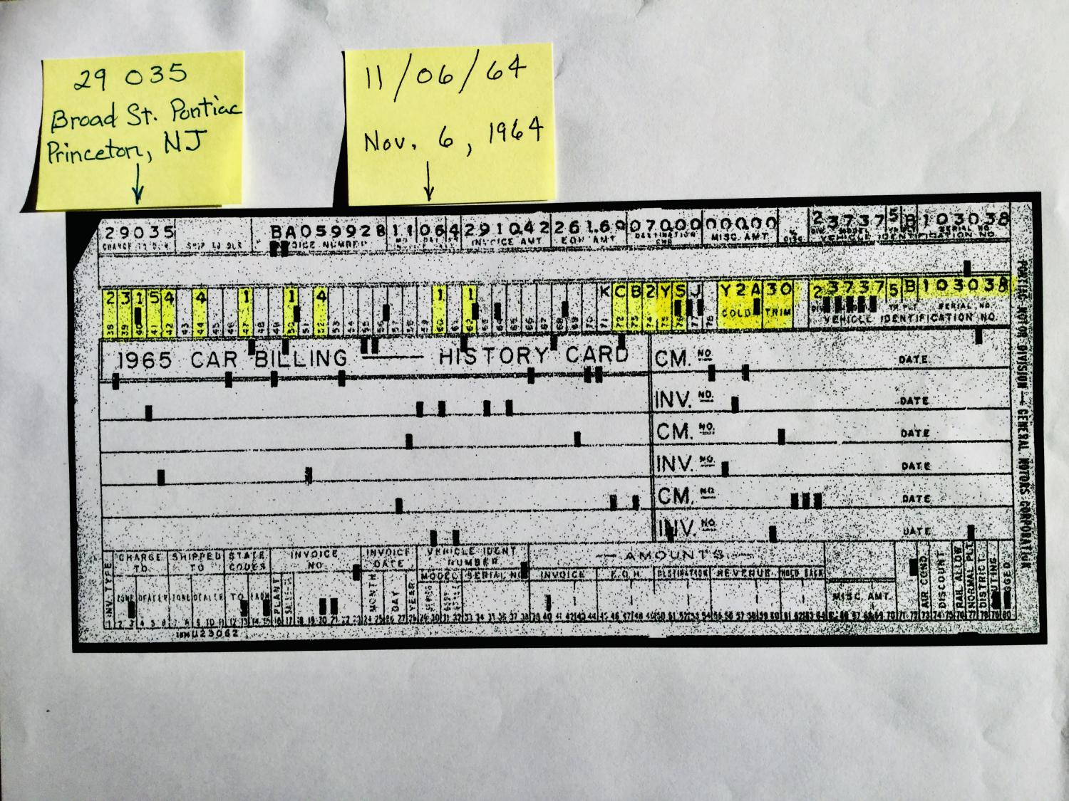 I already had a nice ‘65 Survivor from New Jersey, but I was still compelled to contact the seller for more information on his NJ GTO. I wanted a photo of the firewall “data plate” from his Baltimore built car to compare to my BAL car. The photo he sent me was terrible, but I could still decipher it. His plate says W6 (Bluemist Slate with Black Cordova Top). His Car Billing History card says W2A. My plate says Y6 (Mayfair Maize with Black Cordova Top). My Car Billing History card says Y2A. Confirmation that the Baltimore plant designated “6” for Black, but Pontiac used the number “2” for Black. Several similarities between these two cars besides the N.J. and BAL Built. Factory paint and pinstripes. Same factory Powertrain, 389 4BBL. Automatic Wood steering wheel. Padded dash. Console. Power Antenna. Back up Lamps Seat Belt Delete. Optional 1’’ White Wall tires. His ‘65 had 39,850 My car had 43,440 His Original Owner passed in 2016. My Original Owner passed in late 2014. This car has a lot of potential in the right hands. Most everything incorrect can be resolved. Chris Last edited by 60sStuff; 05-22-2021 at 02:10 AM. |