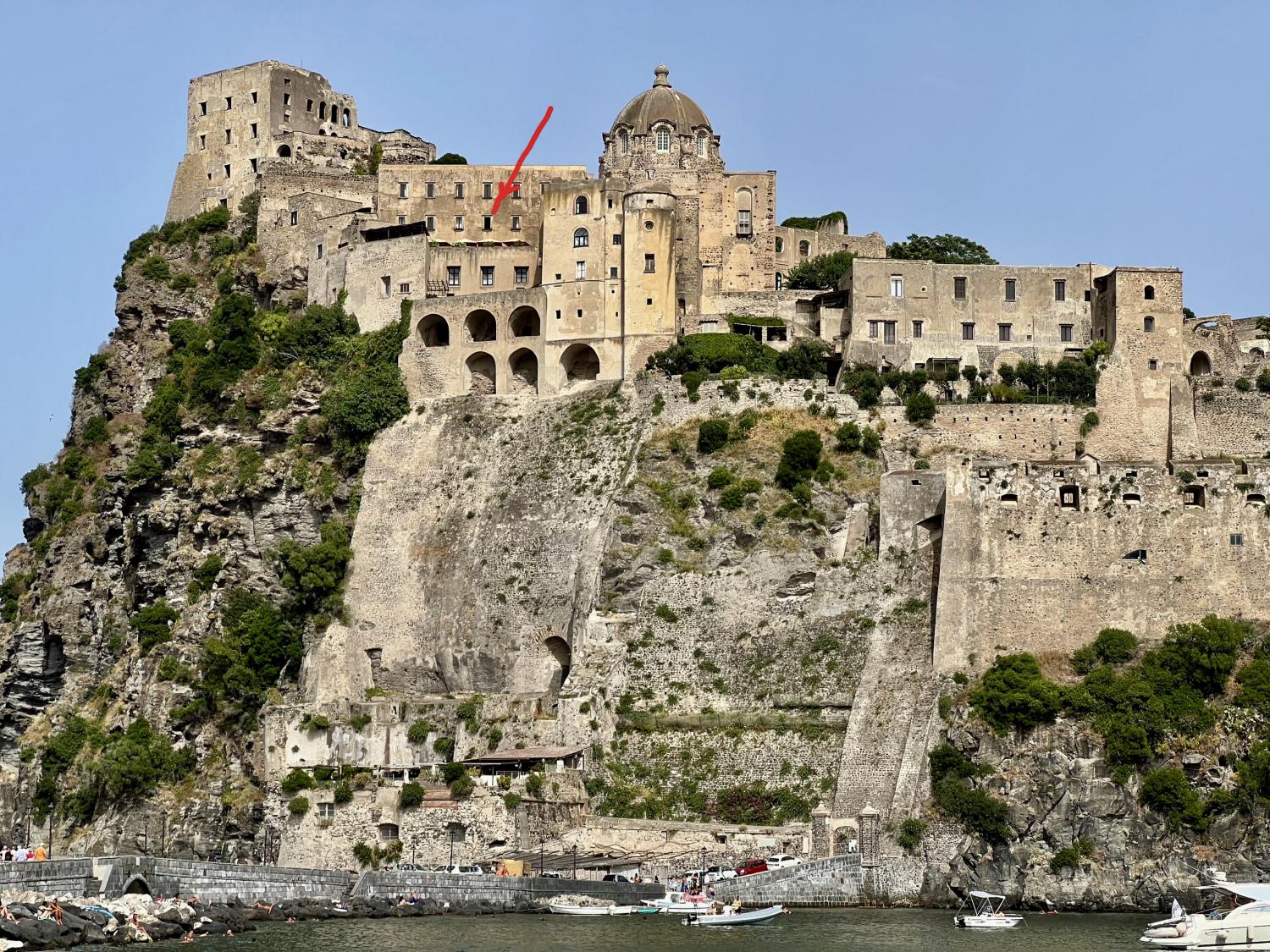 Trasporto Auto Per ISCHIA. Me and the wife took a 3 week vacation in July 2023 to a couple Greek islands and then Italy and stayed several nights in the Medieval Aragonese Castle. Red arrow marks the room we stayed in. Rooms are first class along with the restaurants on this Castle. Highly recommend visiting the island of Ischia and this amazing Castle. I’m checking the drink menu while the wife is walking into the massive garden on this Castle which supplies the restaurants.