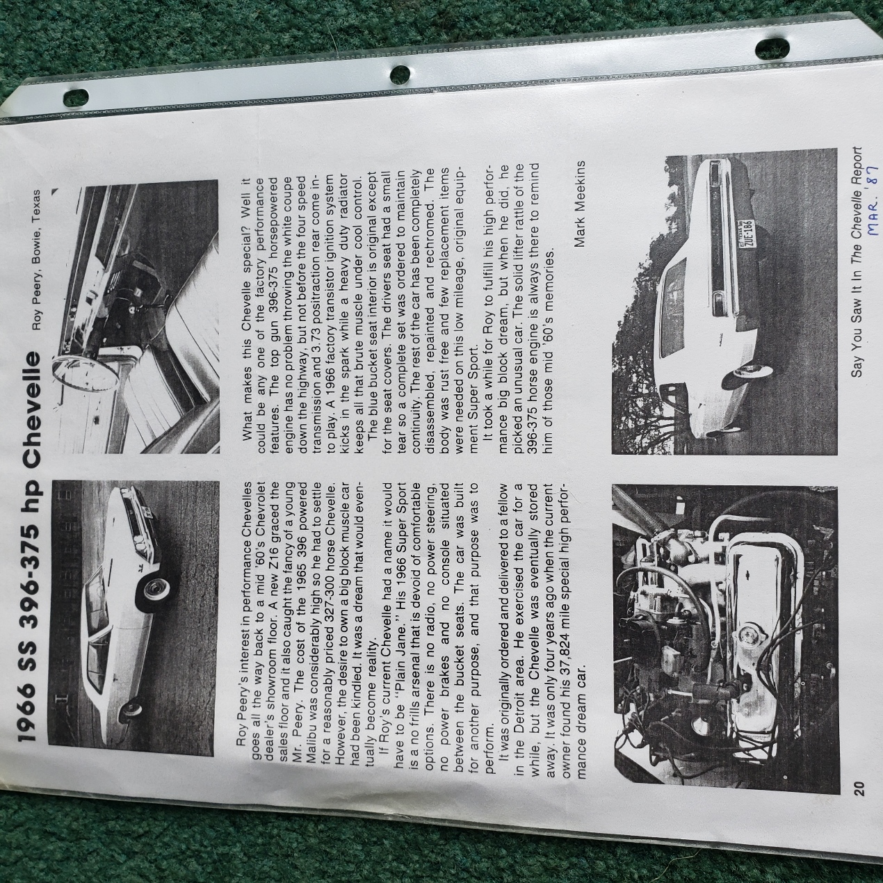 John acquired this Original 1966 SS 396-375 HP Marina Blue Chevelle in 1999 and has driven it very little since he has owned it, it currently has 39,716 documented miles with all original rust free body panels. He has displayed the car at the Hershey AACA meets over the years & acquired Junior & Senior awards. He also met up with the original owner Travis Poore and stayed in contact with him up until about 5 years ago when his health diminished. Linda sent me a list of previous owners, and I tried calling all of them and to my surprise, I got a phone call back from Travis Poore on Monday Nov. 4th, 2024, he is 80 years old now and still has quite the memory of coming home from Germany in 1966 and working for GM. He described every detail of what he wanted and ordered this car for racing, having raced it at Milan, US31 & Bench Bend, KY. I will supply the new owner the contact info for Travis & you can speak to him to verify everything. 1966 SS 396-375 HP Ordered New @ Bob Closum Chevrolet Adrian, MI 06E ST 66-13817Fl1 9741 BODY F-F Marina Blue TR 731-B Blue bucket seats no console Muncie 4-speed w/VIN 144308 CU0526 B 3.73 posi w/metallic brakes Holley 3893229 List-3613 dated 654 factory transistor ignition box & distributor HD Radiator Radio Delete No P/S, No P/B, Travis did tell me he was on his way to pick his girlfriend at the time to go to church & he was shifting between gears & the car shut off & would not start back up, it just clicked as he tried. He had to replace the original block & a 2-bolt block was installed with all the original factory parts. Since John bought the car in 1999, he bought a real 1966 962 4-bolt block dated correct for the car stamped T0412EG. This block will be included with the sale of the car. Travis sold the car to the 2nd owner Larry Demey from MI I believe in 1984, Larry repainted the car white & then sold it to the 3rd owner Roy Perry, from TX. The odometer statement from April 25th, 1987 shows 38,832 miles. Roy had an article written in The Chevelle Report in March 1987 verifying the car as well. Roy completely disassembled the car to repaint & rechromed all the trim, the blue bucket seat interior is all original except the seat covers, the drivers seat had a small tear so a complete set was ordered. The body was rust free and few replacement parts were needed on this low mileage original equipment SS. Video Link https://drive.google.com/file/d/1hEo...?usp=drive_web For more info call 7one7, 3four8, 2four2four Price: $80k includes the date correct 962 4-bolt block. Last edited by 69L78; 11-07-2024 at 09:48 AM. |