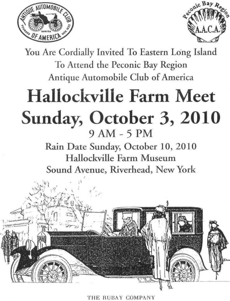 October 3rd, Riverhead, NY. You Are Cordially Invited To Eastern Long Island To Attend The Peconic Bay Region Antique Automobile Club Of America Hallockville Farm Meet, Hallockville Farm Museum, Sound Avenue, 9AM-5PM, Rain Date October 10, Motor Vehicles 25 Years And Older, Trophies, Regional Judging, Dash Plaques To First 200 Vehicles, Judged Cars On Field By 11AM. Tourism And Accomodations Info: (631) 298-5757, Hallockville Farm Info: (631) 298-5292, Meet Info: (631) 589-4779 9AM-5PM, [email protected], [email protected]