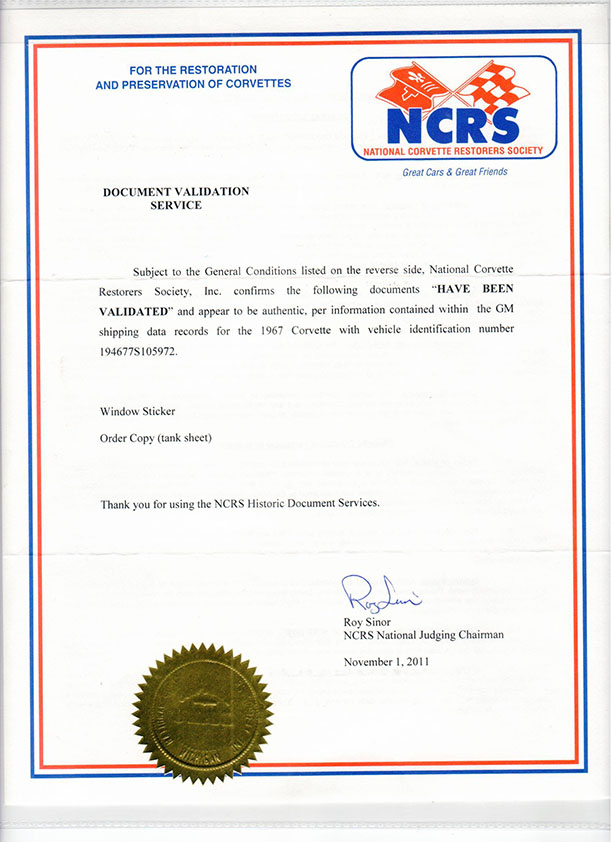But in all fairness, if the car is offered for sale by a dealer and the seller offers a document showing the paperwork has been validated by NCRS, why would they or anyone else really dispute that. NCRS, if they are going to validate has to look further than just verifying numbers match their GM records...... Paul