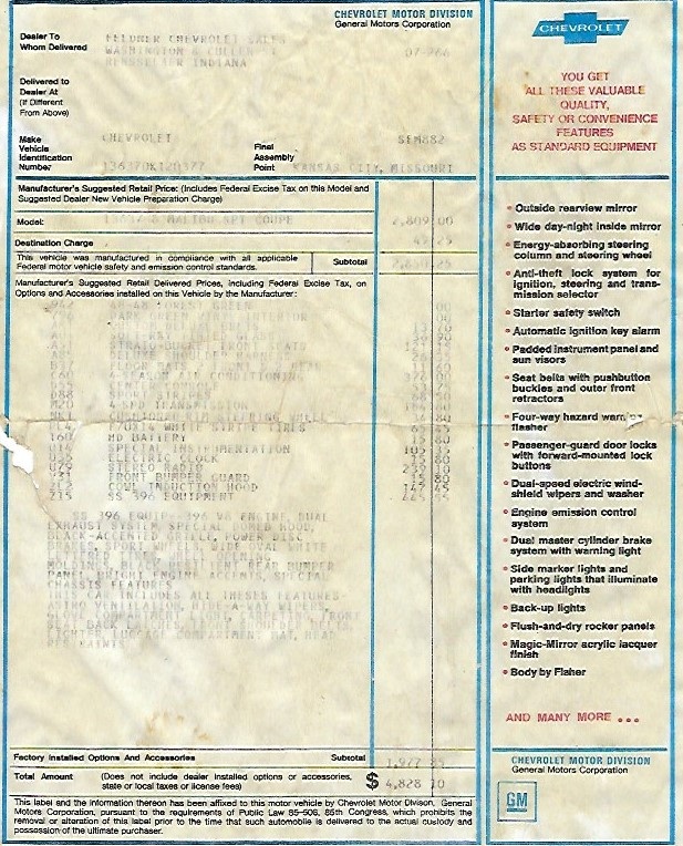 I actually received a nice PM from a previous owner of this car. I'll post it below, verbatim, in case anyone is interested possibly buying the car: __________________________________________________ ________________ Hi, My name is Mark. I guess I don't post enough as I cannot respond on this page but wanted to let everyone know about his car. I owned it. Was a very strange sale when I sold two years ago. Car was VERY nice. All numbers matching. Build sheet, window sticker, Protecto Plate etc. Long story but I was very careful in the transaction as I was concerned about a Scam on the buying end. They were in such a hurry to get the car that they did not even get the original window sticker which I still have to this car! I texted them multiple times that I could send it to them if they wanted but they said they would call me. Again, was a very real 396/350 4 speed with AC and fully documented. I have lots of pictures and detail if anyone is interested. Mark |