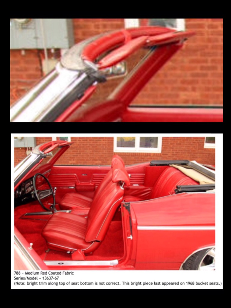 Looking to see the correct shape and material pattern of the red sun visors. Plus, this is a Canadian Convertible Chevelle. Lots of different enmolilies. Dan