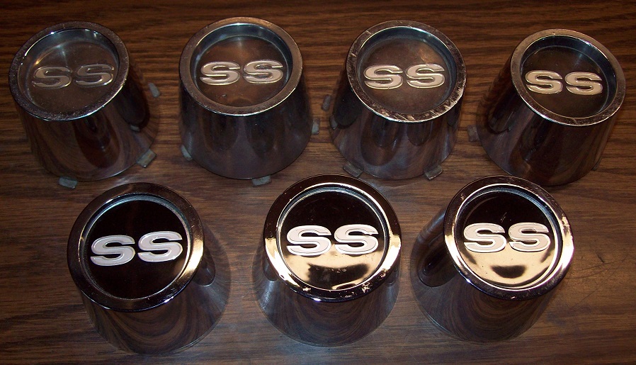 SS Wheel Center Caps Survivors Deep set with retainers and screws for a Driver or Survivor, SS center emblems a bit faded and all 4 came off the same car, comes with original retainers and screws $100 USD plus $22 Shipping.
