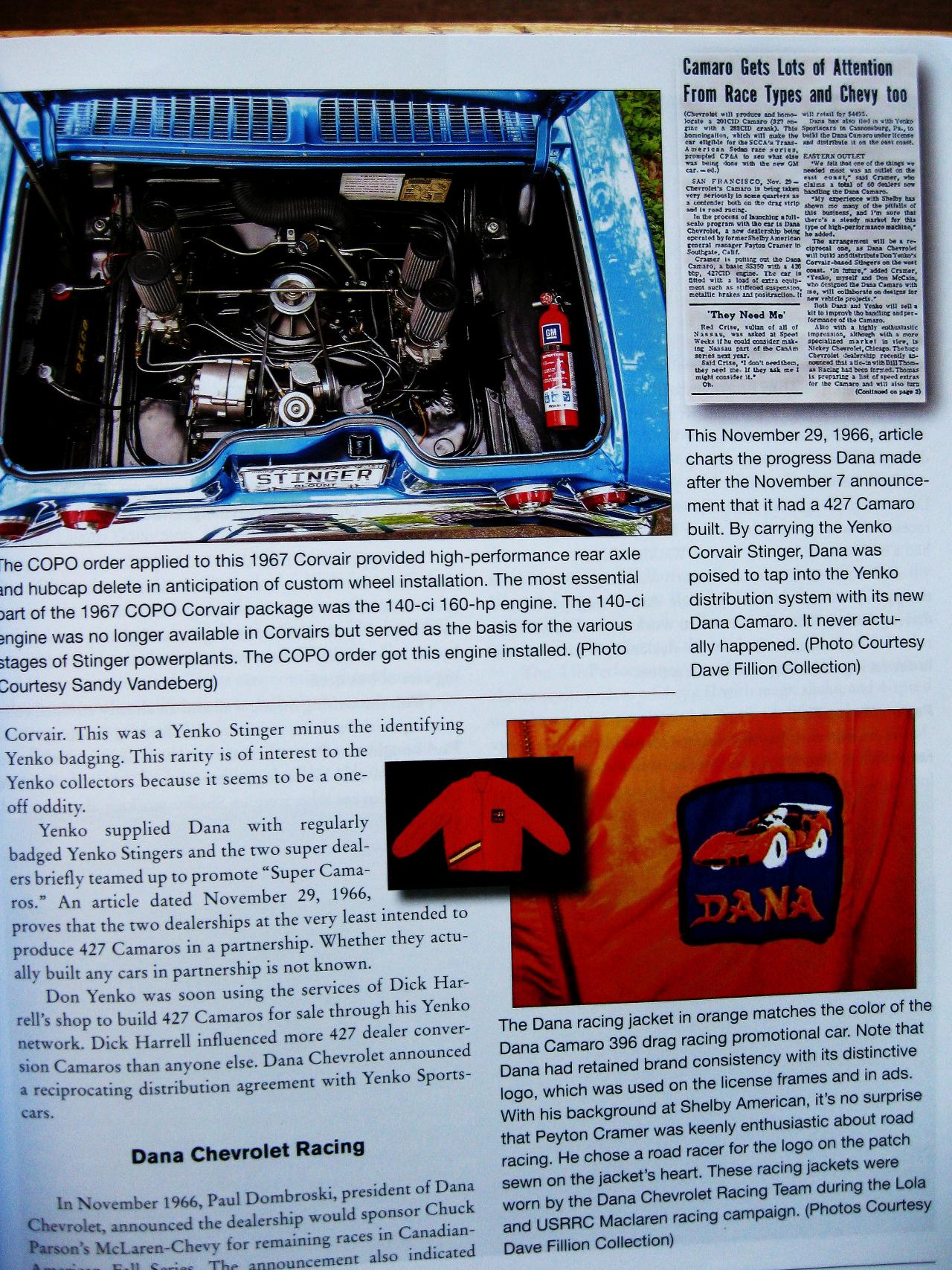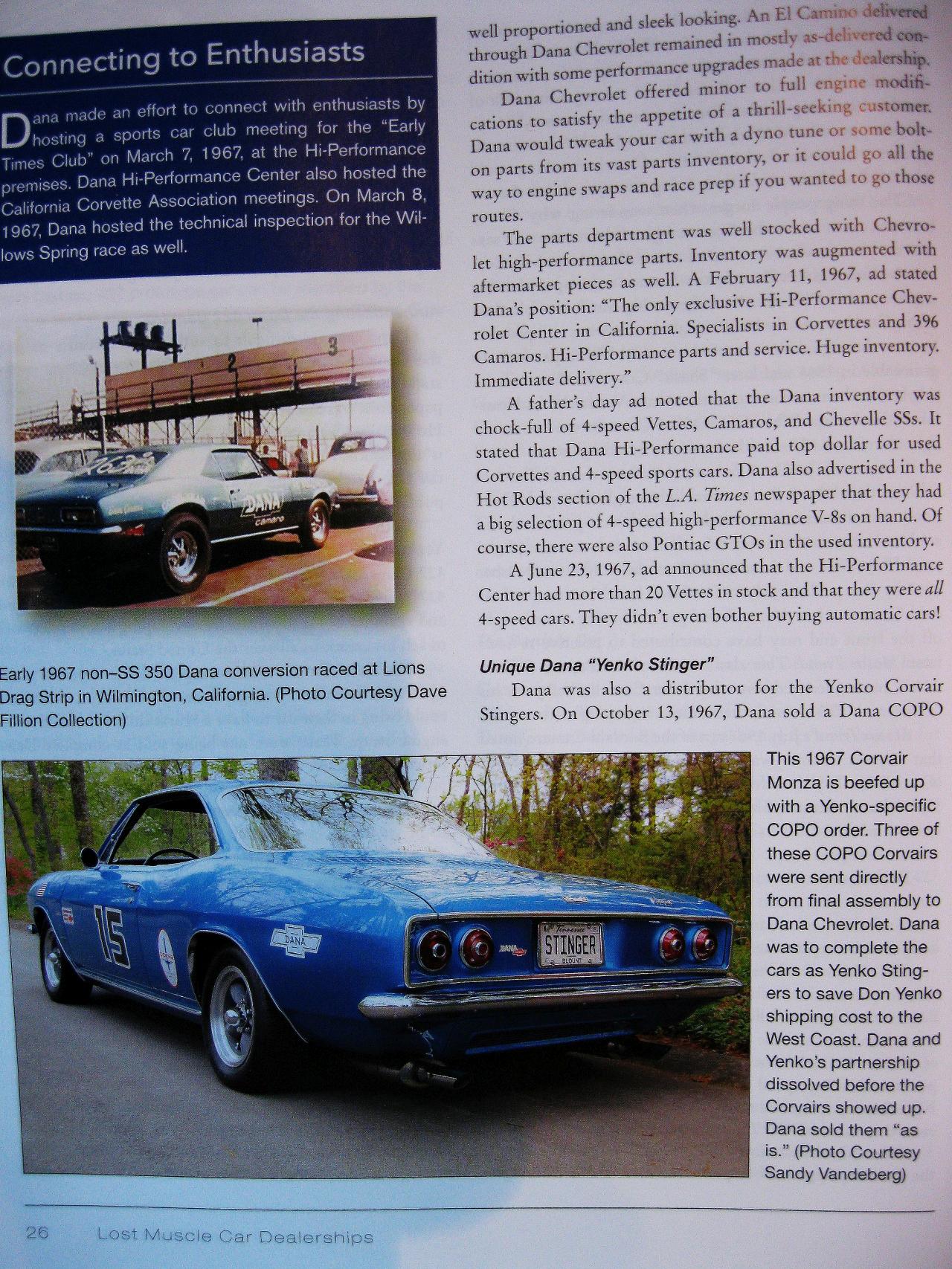 I was lucky to be placed in the New Book ** LOST MUSCLE CAR DEALERSHIPS **, The book contains 192 pages, with 350 vintage photographs of some 20 dealerships of the 1960's. My DANA C.O.P.O. Corvair is listed with the ** DANA CHEVROLET DEALERSHIP**. ON PAGES, 26 & 27...My Corvair was the connecting element of the << DANA - YENKO >> RELATIONSHIP AT THAT TIME..>>>>>>>>>>>>>>>>>