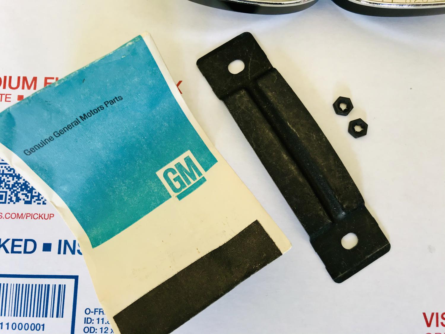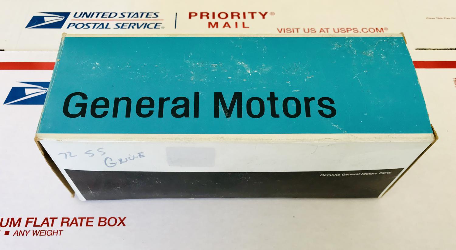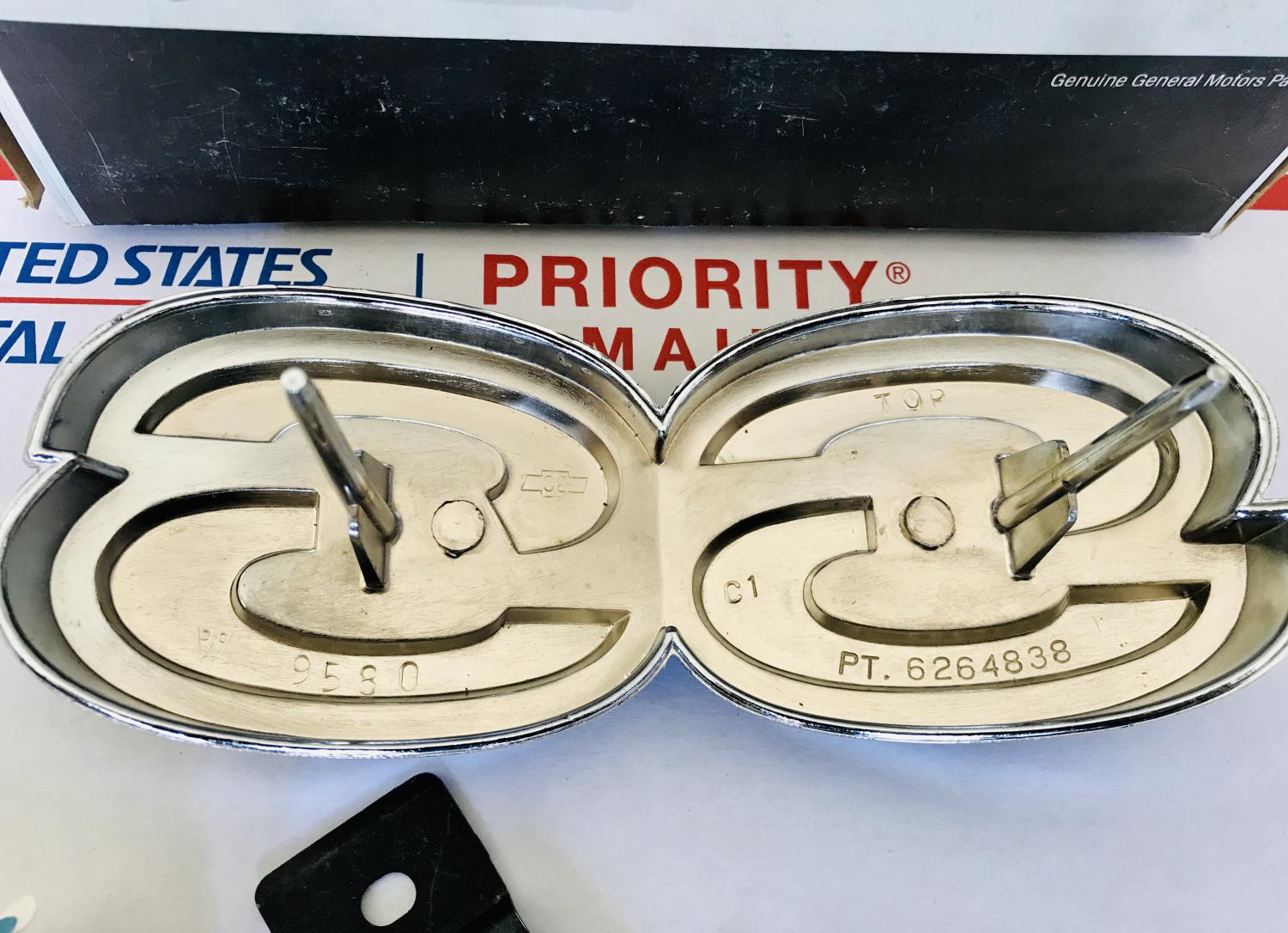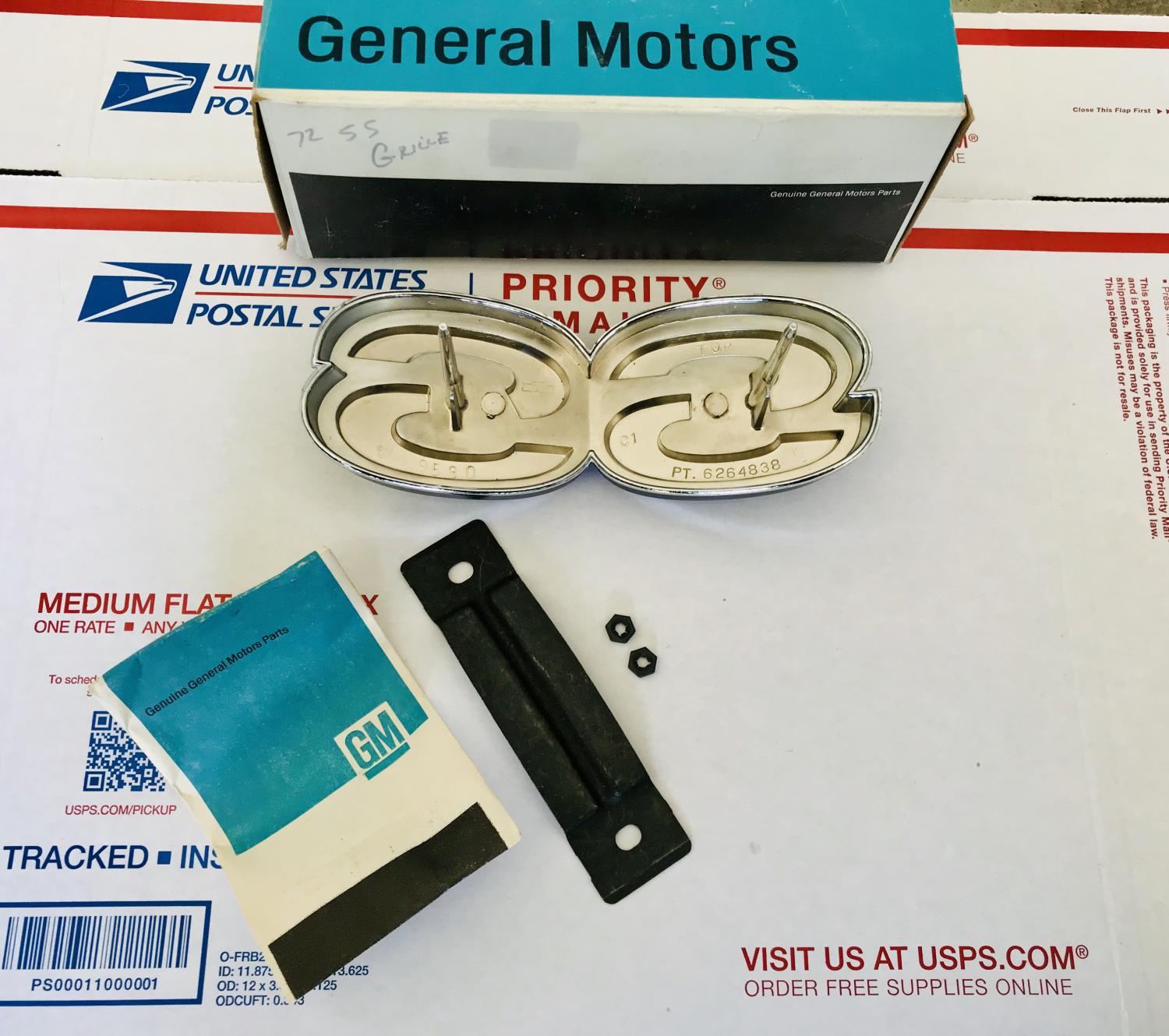 NOS GM grill emblem kit for a 1972 Chevelle SS, part # 6272090. The part number for the emblem is # 6264838. The box is in excellent condition. It comes with the retainer and nuts in the original pouch. This has been stored indoors since the late 1980s. (SOLD)