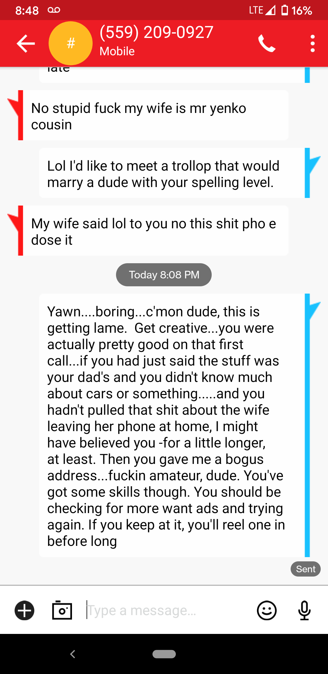 Had a guy call me this afternoon...he says he's up in Washington state clearing out his dead father in laws house and that his father in law had hoarded NOS Camaro parts his whole life. He tells me he has boxes and boxes of stuff but he's gotta get rid of it within the next day and a half. But his wife wants to throw it all away and won't ship it to me. Says his phone is broken and his wife forgot hers at home in New Mexico. Coincidentally, I have a trucker buddy of mine going through there in a week so I line up a friend in the area that could Co pick it up. All of a sudden the guy wants to ship it and wants me to pay him with Zelle...but he's leaving town tonight. Wouldn't give me an address and when he finally did, it was bogus. Phone number was 559-209-0927 beware!