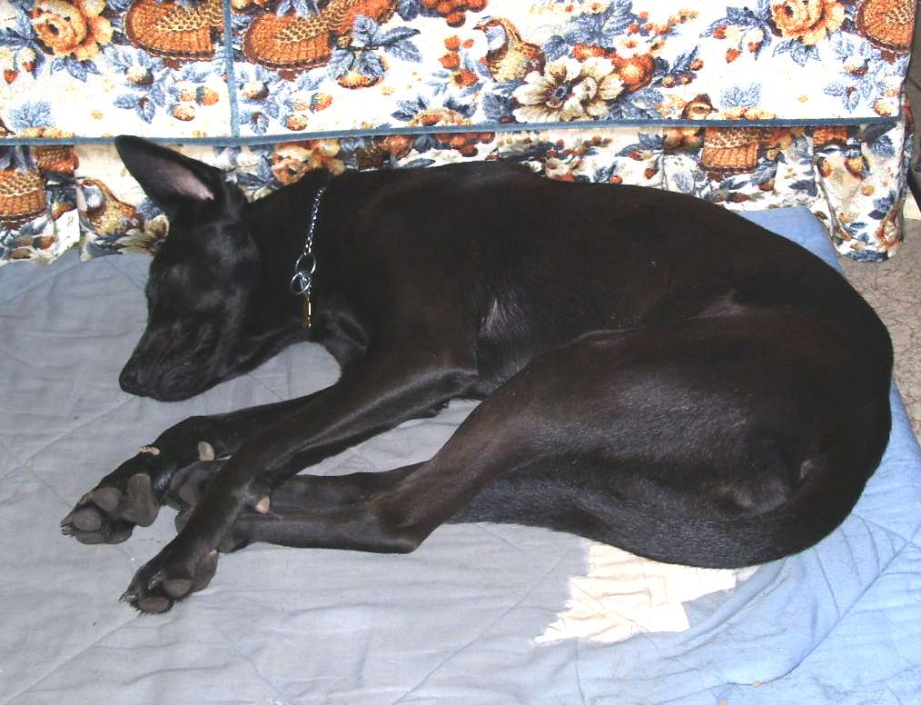 Here's a couple pictures of our old dog Jackie, she was a strange mix of black lab, whippet and some pitbull. And then Layla, the new edition.