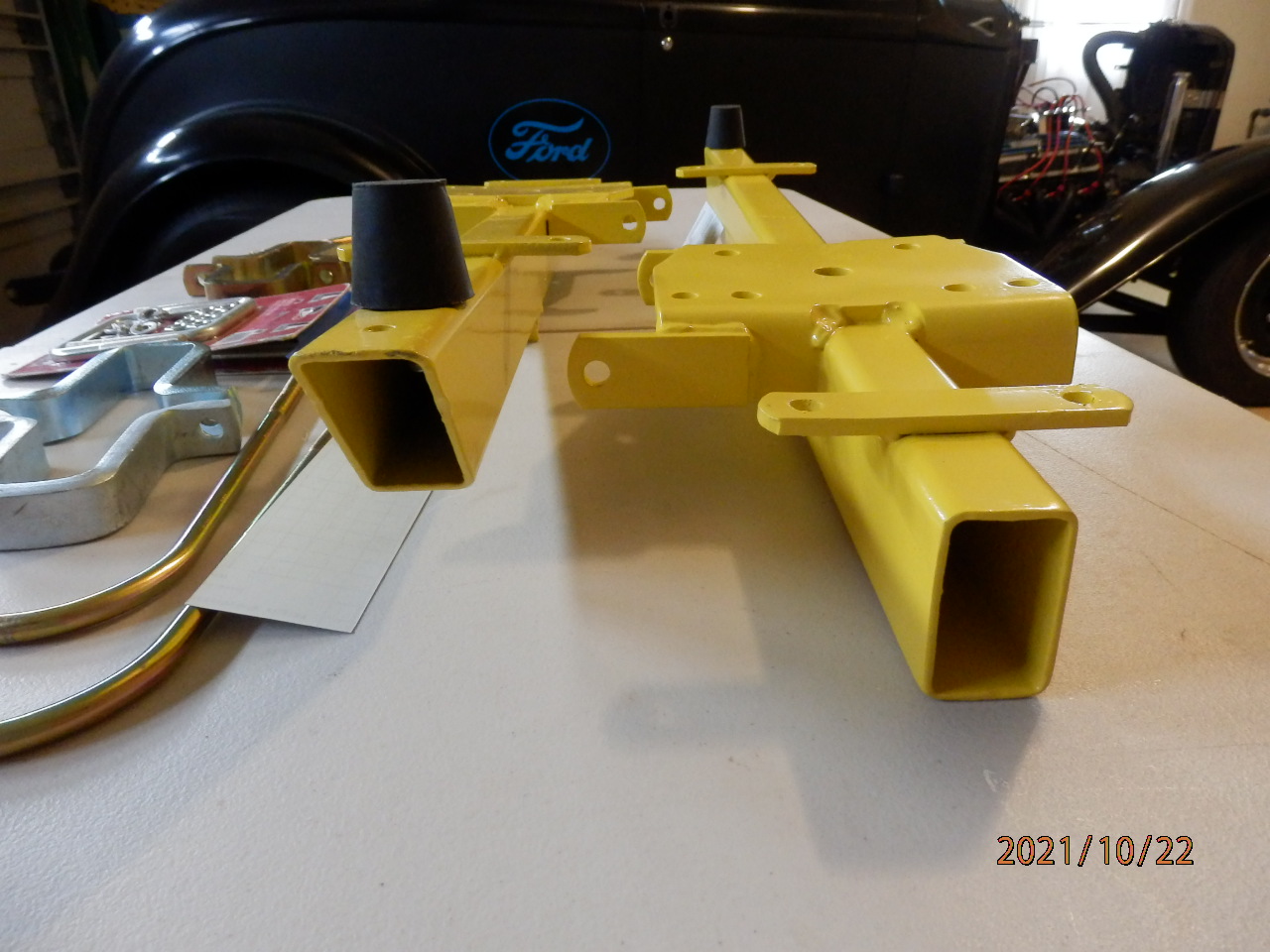 This is a very nice pair of early 1970's Lakewood bars that have been sandblasted & epoxy primererd, the hardware is either NOS or replated & comes with the correct decals. You have the choice of the gold cad or the clear cad stirrups, the U-bolts are replated gold cad.