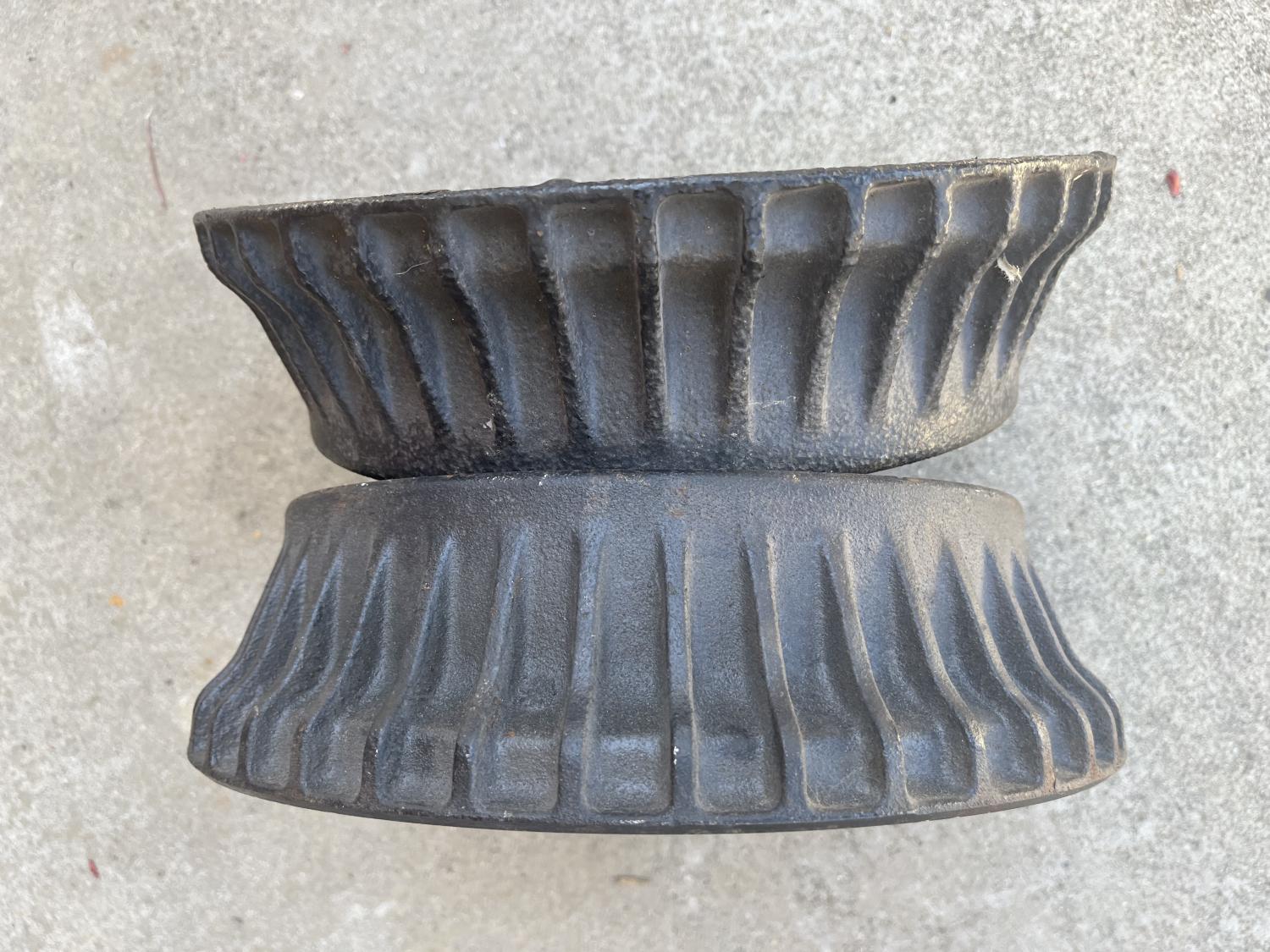 One is a little less pitted than the other and that other one has lug holes and seem a little wallowed out and out of round - definitely not fatal, but you should be aware - I doubt it causes any issues, just aesthetic. See detailed photos. Could likely get away with a scuff rather than a full on turning. Could also blast them to strip the black paint if you're restoring them.