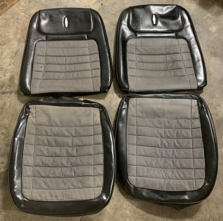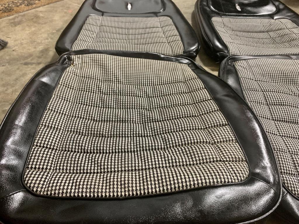 '68 Deluxe interior houndstooth seat covers. I would consider them to be pretty nice. There is a rub mark on the pass top and are 2 wear spots (one on driver bottom and the other on the passenger top in the houndstooth) but I feel a good upholstery person can repair. There is also one small puncture on the pass bottom on the tunnel side that too and have a patch laid on the inside and repaired push its on the tunnel side so will most likely not be seen especially if you have a console car. Regardless still a very rare pair of covers in this condition. $750 plus shipping.