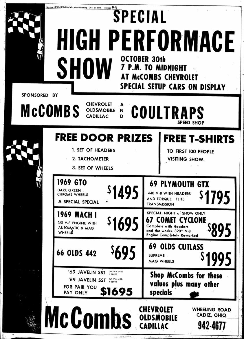 Numerous Yenkos and Copos. People would come from surrounding states to shop at Coultraps Speed shop. Coultrap installed everything they sold. People would drop off a brand new car in the morning and pick it up later in the day with a new intake, carb, headers and wheels etc. Doc Dixon worked behind the coungter and Coultraps sponsored at my last count over 50 cars including Fink Bros out lof Zanesville, Hiner and Miller from Akron etc. Sponsored cars from PA as well. Here is a 69 Yenko Chevelle in ad out of Cadiz. The guy who owned the car still lives there. I'm going to visit him later this week. He is in his mid 80's now. The Hemi and Buick GS are all within a few miles of Cadiz. The 67 Yenko in the pictiure still sits in a garage in Cadiz. It is either the first one made or the first one sold I cannot remember. The original owner got mad at Don Yenko and took a screwdriver and yanked of the emblems and threw them at Don from across the parking lot. Last edited by whitetop; 06-28-2023 at 03:08 AM. |