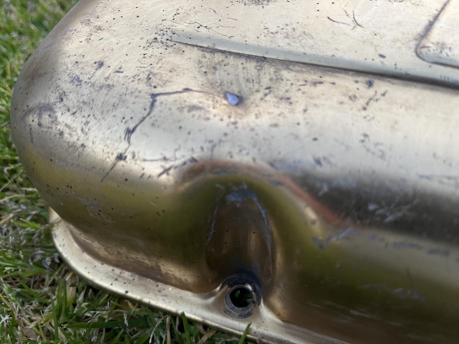 Some wear marks from being stored / shuffled around for years - and a ding as shown from something falling on it I would guess, There's also an abrasion where some of the finish is gone. There's black soot (the dots in the pics) on it in the photos but that comes off with a water soak and your fingernail; I left them out last night on the grass and they got dew on them and the spots come right off with my fingernail this morning without affecting the gold finish, but I'm leaving them as-found so you know what you're getting; they'll clean up better than shown below.