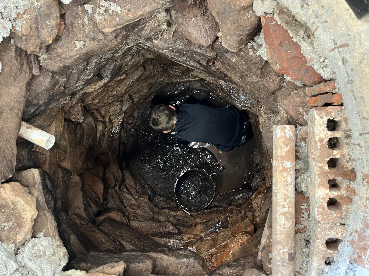 Well, yesterday, the twins (my 10 year old grandsons) and I got a wild hair and decided it was finally time to clean it out. As always, Sherri was an integral part of the equation. I was hoping it was a wishing well at some point and had visions of finding gold and silver coins from the 1880s and 1890s. We have no proof, but surmise that it was used to supply water to the trains at some point. There is a platform by the tracks that looks like could have been the mini watering tower, but no sign of a well by it. After pumping water out the best we could, we (me and the boys) took turns climbing down in the well and digging stuff up. Probably pulled up 300 pounds of old water logged wood. Early on I pulled up what I could tell was a skull. Thankfully, it wasn’t a human skull, but that of a dog. We eventually pulled out six dog skulls and two rat sculls. Of course, all the other bones were down there as well. We also found four dog collars, so they were not just strays. Like most wells, I assume this one had a circular wall above ground at one time. I have a hard time believing that domesticated dogs just kept falling in. I am guessing some heartless bastard was tossing dogs in from time to time just to drown them. The boys spent most of the afternoon sifting through the mud, pulling out all the bones, cleaning them and putting them in a pile. We are going to try to “reconstruct” one dog from all the biggest bones. We won’t be drilling and connecting with wire, just laying them out in order. Nice anatomy lesson. Oh yeah, no coins.