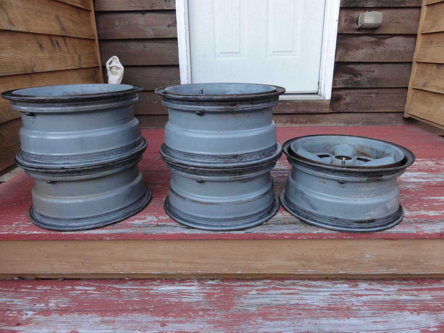 5) 1970 Z28 Camaro Wheels all dated 2-4-70 all came off the same car very good condition, Lug nut holes very good. Fronts were sprayed with primer rest of wheels still maintain original factory paint . Some surface rust see pics. These were dismounted from there original F-60- 15 good year tires from the factory . Wheels are for sale only.One wheel the 2 is faint but is present , 1950.00 plus Shipping.