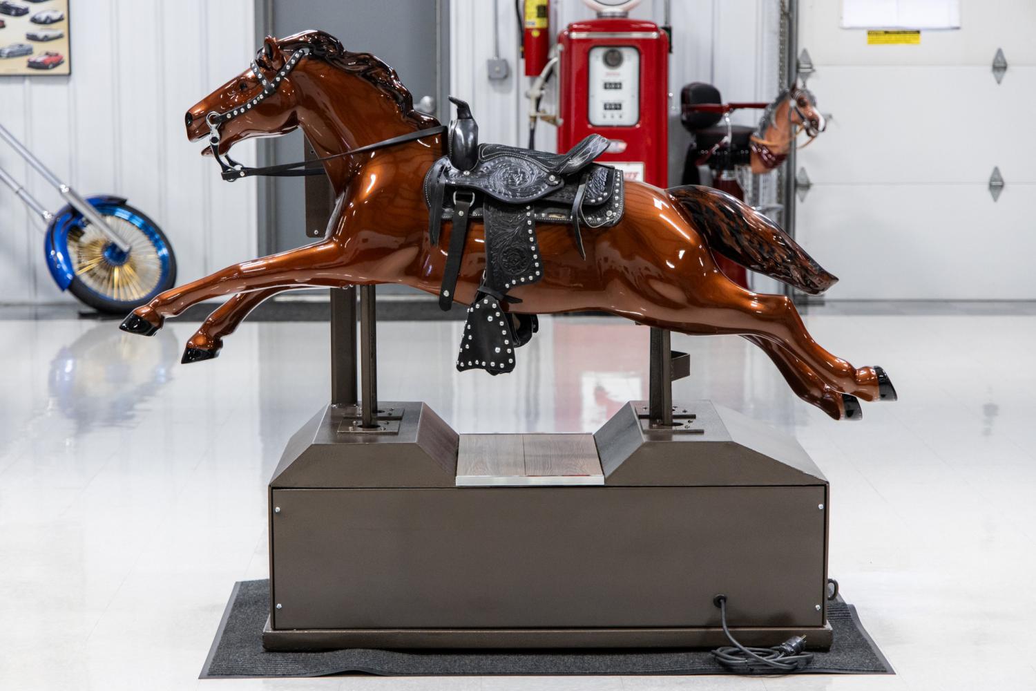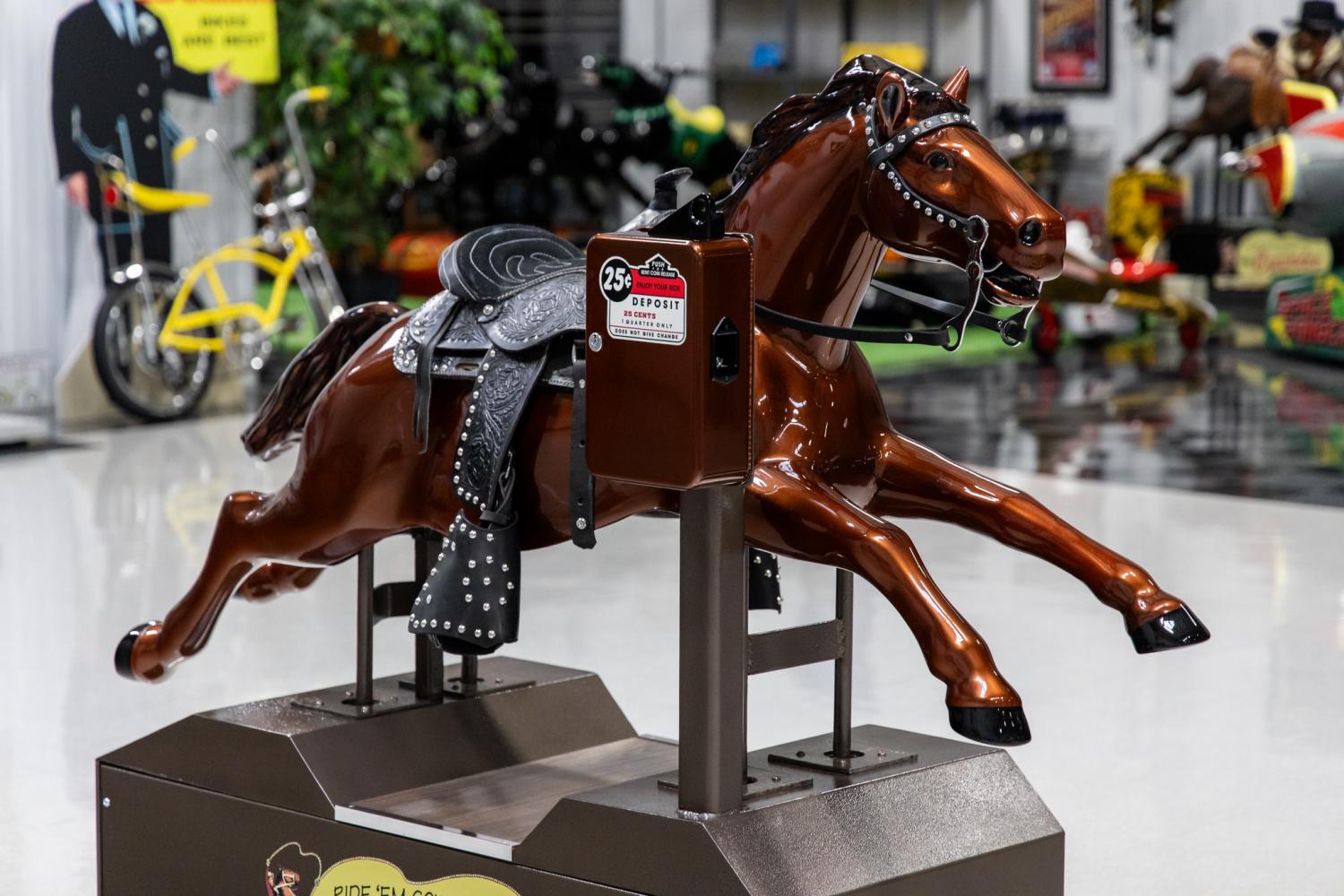 This gorgeous 1952 Bally Champion Horse Coin Operated Kiddie Ride is a great display and conversation piece. This model is desirable among collectors and enthusiasts because it's considered a full-body horse. The Bally Manufacturing Company produced the “Ride the Champion” Horse in 1952 at their facility located in Chicago, IL. The name “Ride the Champion” comes from the popular T.V. show with Gene Autry's horse, “Champion the Wonder Horse”. Bally advertised the kiddie ride to vendors as “the greatest money maker in the entire amusement industry”. This realistic western horse was sturdy with a trouble-free mechanism and slug proof coin mechanism. The real western saddle with a safe low-speed start provided life-like riding action. These rides were placed all across the United States and commonly in front of grocery stores. The ride provided young children an imaginary horseback journey to the Old West. The ride crated great ever-lasting memories and is a true piece of Americana. This example was the product a show quality cosmetic restoration. It was completed in 2023 and was a display piece until it was purchased by MS CLASSIC CARS in March of 2024. This is the first time it's been listed for sale.