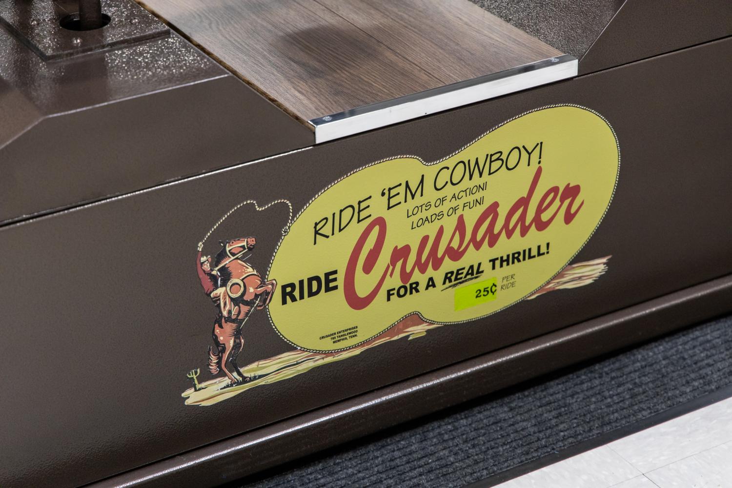 The original steel base exterior was stripped, prepped and repainted in brown. The base was decorated with a matching wood step platform, stainless trim and Ride Crusader “Ride 'Em Cowboy” decal. The decal was changed to 25 cents. This decal is easily removable if the new owner wants to change the theme. The base internal steel and mechanisms are in good original condition. The Dayton model #5K444C motor has a date code of July 1992. The motor is a 115 Volt with 1/3 HP and 1725 RPM. A custom steel piece was added to support the coin box. The coin box was produced by Coin Mechanisms, INC located in Glensdale Heights, IL. From the information gathered it's from the 1950's and 1960's timeframe and is equipped with an analog timer. The exterior of the coin box was stripped, prepped and painted Copper Metallic to match the color of the horse. A new decal was added reflecting the change to 25 cents.