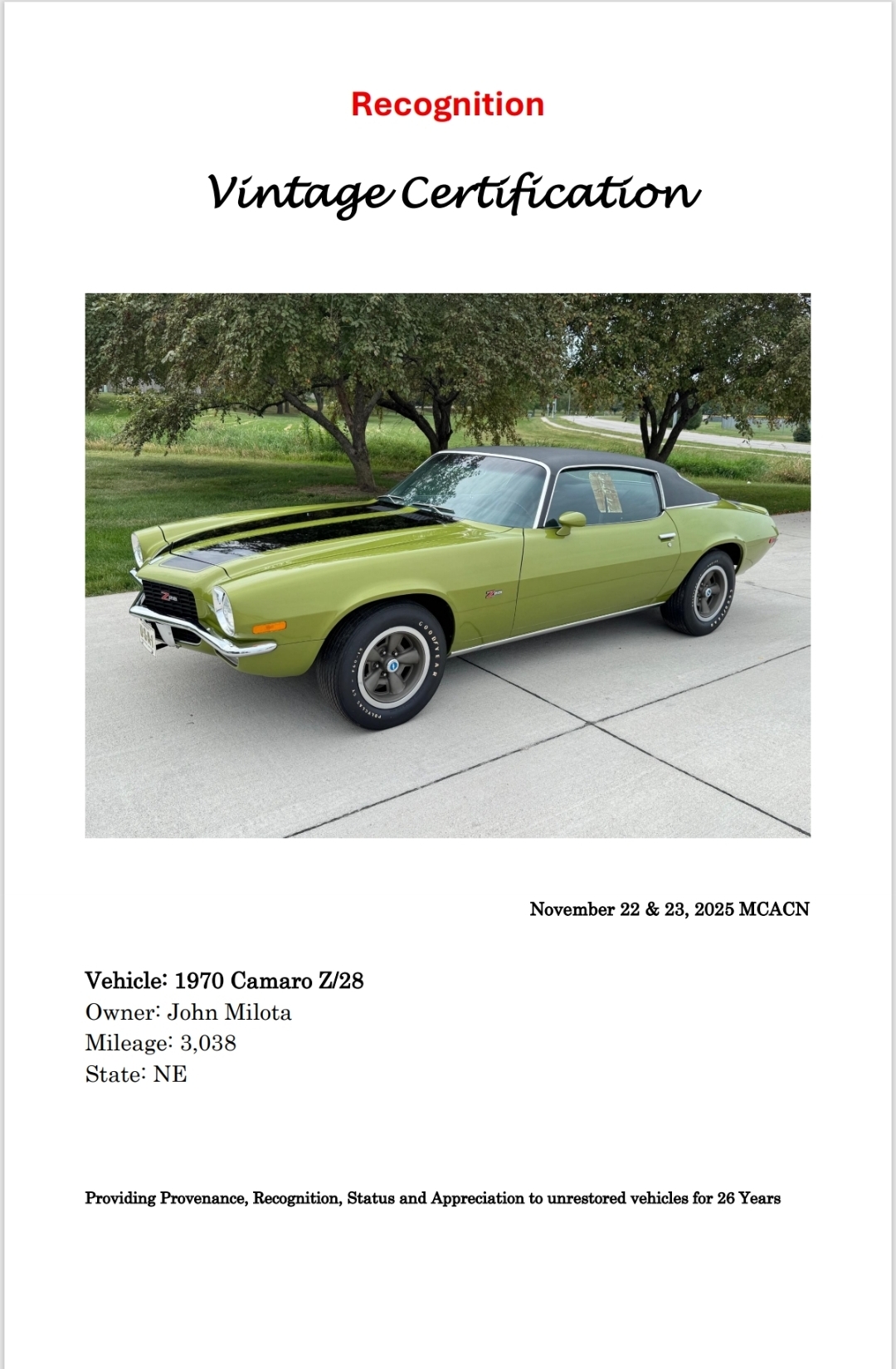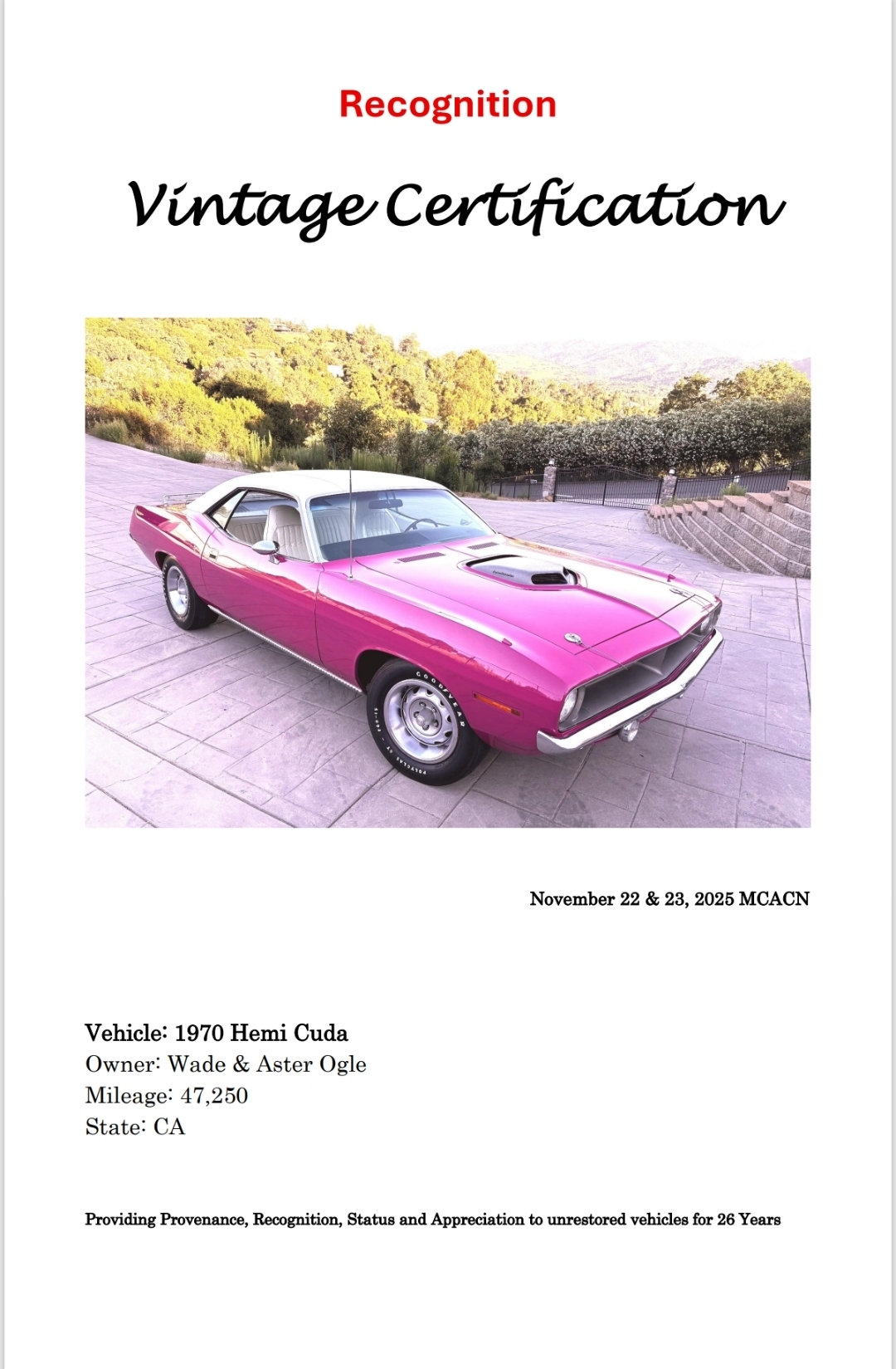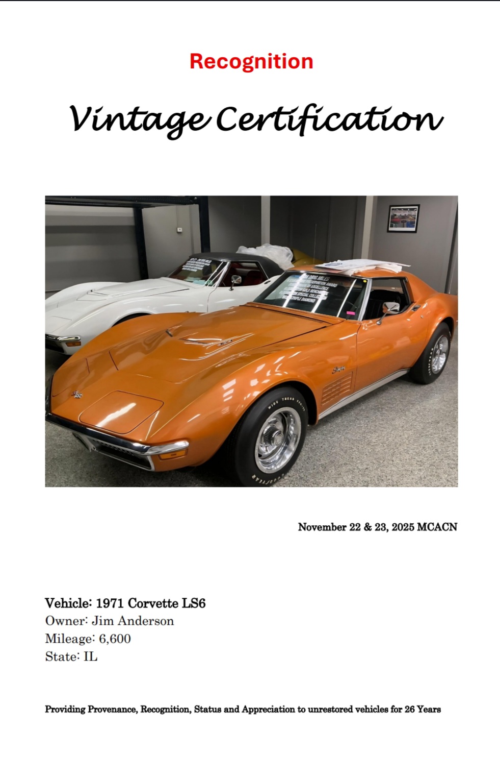 Vintage Certification™ is a judging program whose sole purpose is to recognize, provide status, provenance, and promote un-restored (survivor) vehicles. We believe it is the only program that focuses on documenting and benchmarking these cars. Our core certification team consists of Brett Merryman, Barry Martin, Paul Martin, Lloyd Costley, Steve Minore, Chris White, Scott Tiemann, Frank Badalson, Rich Johns, Gary Bosselman, Jason Billups, John Ballard, Steve Shauger, Jody Anderson, Alex Sahely, Mitch Despen and other marque specialists based on make and model. Each core team member possesses over 30 years' experience as restorers, collectors, historians and judges in the hobby. Typically, we spend 3hrs examining in detail every segment of your car including the underbody on a lift. To learn more about Vintage Certification visit our website at www.vintagecertification.com or the MCACN website at www.mcacn.com. This is the perfect venue to have your vehicle certified. You will be among and exclusive group of enthusiasts who participate in this exciting event. We understand not every original car is 100% untouched, and we offer five levels of certification, based on the originality of the Vehicle. Vintage Certifications™ five divisions: Vintage Time Capsule - Vehicles that are 95+% unrestored in all reference areas Vintage Legend - Vehicles that are 85+% unrestored in all reference areas. Vintage Heritage - Vehicles that are 85+% unrestored in five reference areas. Vintage Legacy - Vehicles that are 85+% unrestored in four reference areas Vintage Reference - Vehicles that are 85+% unrestored in three reference area. Reference Areas: Certification consists of two areas of consideration, Originality and Preservation. Reference areas are as follows: • Operation • Engine Compartment Area • Exterior Body • Interior Body • Underbody • Trunk (except Corvette) This year's Vintage participation requests have been overwhelming. We were essentially full by May. We are at out limit, but our team is up to the task. We are now accepting applications for 2025. We have limited certification slots available and suggest you apply early before they are filled. If you are interested or have questions call or visit our website at: www.vintagecertification.com for more info such as, rules and guidelines and downloadable application. Vintage Certification @ MCACN 2025 Roster is shaping up and many more in process: 1963 Ford Galaxie 500 XL 2.8 miles 1964 Ford Galaxie 500 XL 12 miles 1970 Buick GSX Stage 1 12,900 miles 1966 Tempest ohc 6 4,700 miles 1970 GTO Judge 60,829 miles 1970 Boss 429 with 9,140 miles 1970 Hemi Cuda Moulin Rouge 47,000 miles 1965 GTO Tripower Convertible 76,667 miles 1971 LS6 Corvette 8,864 miles 1970 Camaro Z28 3,038 miles 1969 A12 Road Runner 26,000 miles 1975 Corvette Convertible 9,259 miles 1978 Trans Am 6,000 miles We presently have room for one more car, but time is running out so contact me ASAP!