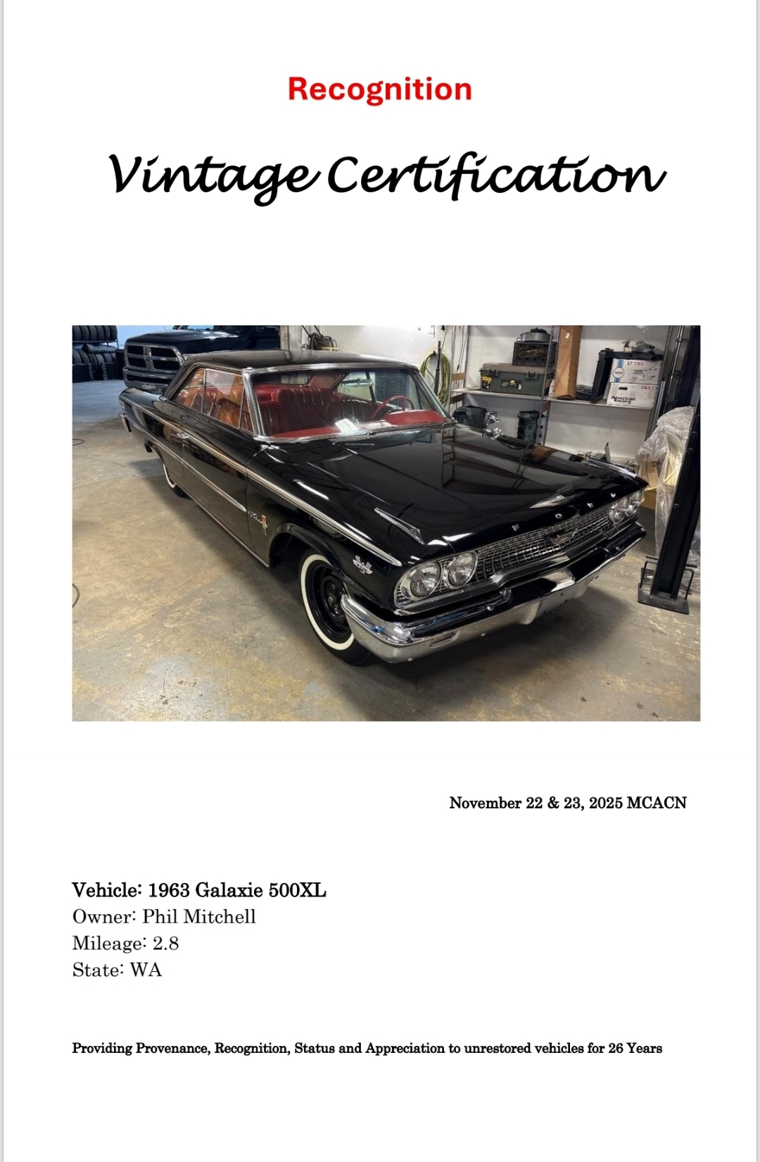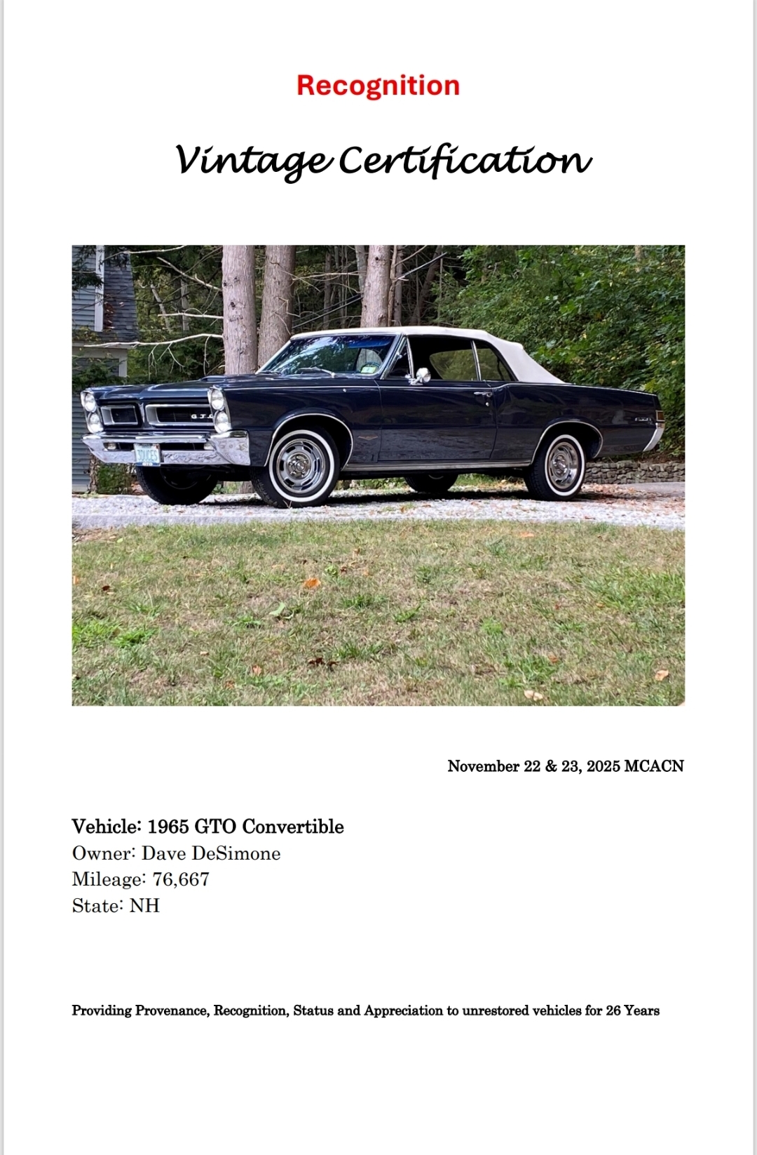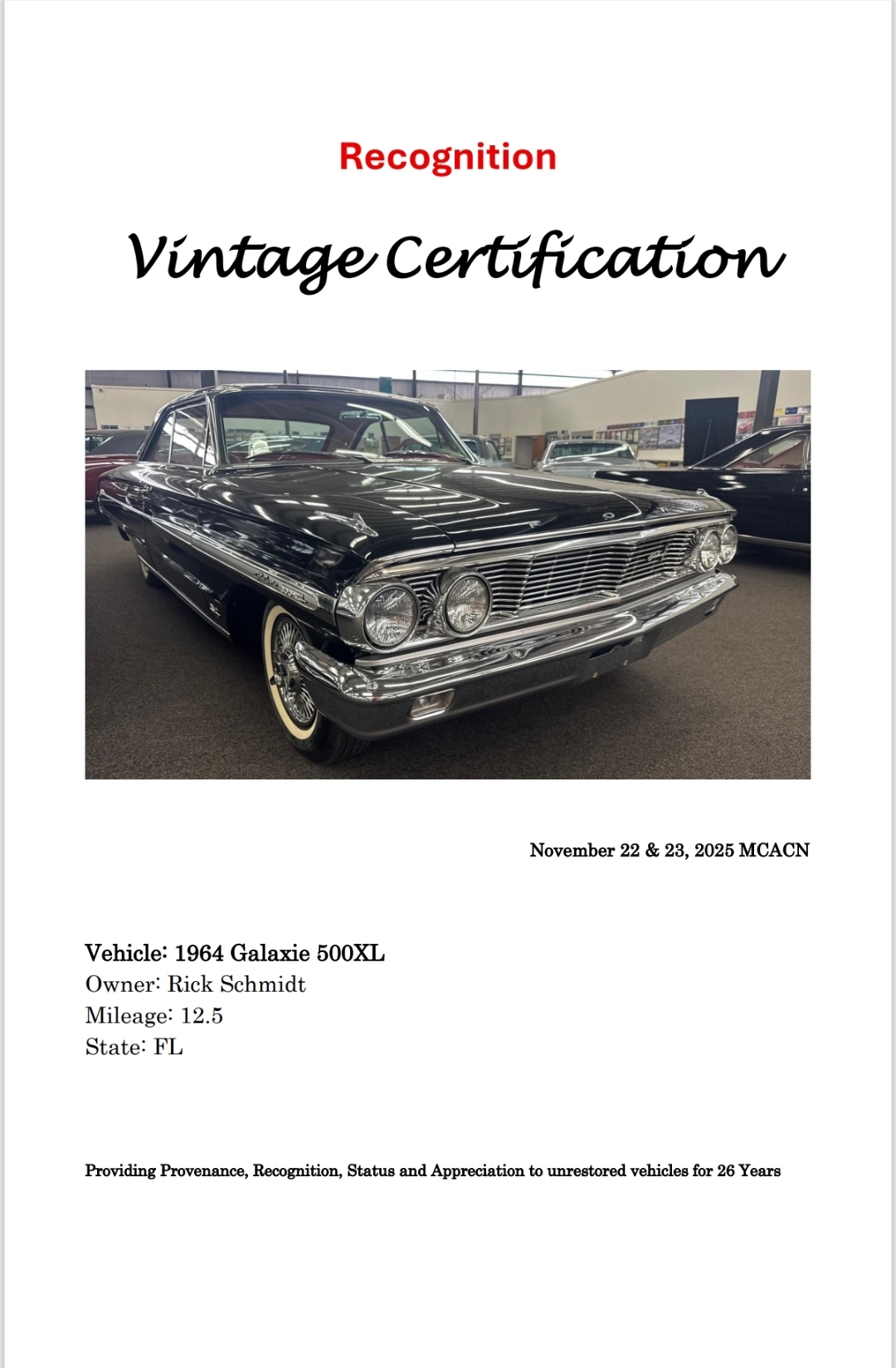 Vintage Certification™ is a judging program whose sole purpose is to recognize, provide status, provenance, and promote un-restored (survivor) vehicles. We believe it is the only program that focuses on documenting and benchmarking these cars. Our core certification team consists of Brett Merryman, Barry Martin, Paul Martin, Lloyd Costley, Steve Minore, Chris White, Scott Tiemann, Frank Badalson, Rich Johns, Gary Bosselman, Jason Billups, John Ballard, Steve Shauger, Jody Anderson, Alex Sahely, Mitch Despen and other marque specialists based on make and model. Each core team member possesses over 30 years' experience as restorers, collectors, historians and judges in the hobby. Typically, we spend 3hrs examining in detail every segment of your car including the underbody on a lift. To learn more about Vintage Certification visit our website at www.vintagecertification.com or the MCACN website at www.mcacn.com. This is the perfect venue to have your vehicle certified. You will be among and exclusive group of enthusiasts who participate in this exciting event. We understand not every original car is 100% untouched, and we offer five levels of certification, based on the originality of the Vehicle. Vintage Certifications™ five divisions: Vintage Time Capsule - Vehicles that are 95+% unrestored in all reference areas Vintage Legend - Vehicles that are 85+% unrestored in all reference areas. Vintage Heritage - Vehicles that are 85+% unrestored in five reference areas. Vintage Legacy - Vehicles that are 85+% unrestored in four reference areas Vintage Reference - Vehicles that are 85+% unrestored in three reference area. Reference Areas: Certification consists of two areas of consideration, Originality and Preservation. Reference areas are as follows: • Operation • Engine Compartment Area • Exterior Body • Interior Body • Underbody • Trunk (except Corvette) This year's Vintage participation requests have been overwhelming. We were essentially full by May. We are at out limit, but our team is up to the task. We are now accepting applications for 2025. We have limited certification slots available and suggest you apply early before they are filled. If you are interested or have questions call or visit our website at: www.vintagecertification.com for more info such as, rules and guidelines and downloadable application. Vintage Certification @ MCACN 2025 Roster is shaping up and many more in process: 1963 Ford Galaxie 500 XL 2.8 miles 1964 Ford Galaxie 500 XL 12 miles 1970 Buick GSX Stage 1 12,900 miles 1966 Tempest ohc 6 4,700 miles 1970 GTO Judge 60,829 miles 1970 Boss 429 with 9,140 miles 1970 Hemi Cuda Moulin Rouge 47,000 miles 1965 GTO Tripower Convertible 76,667 miles 1971 LS6 Corvette 8,864 miles 1970 Camaro Z28 3,038 miles 1969 A12 Road Runner 26,000 miles 1975 Corvette Convertible 9,259 miles 1978 Trans Am 6,000 miles We presently have room for one more car, but time is running out so contact me ASAP!