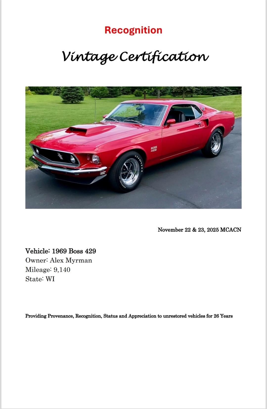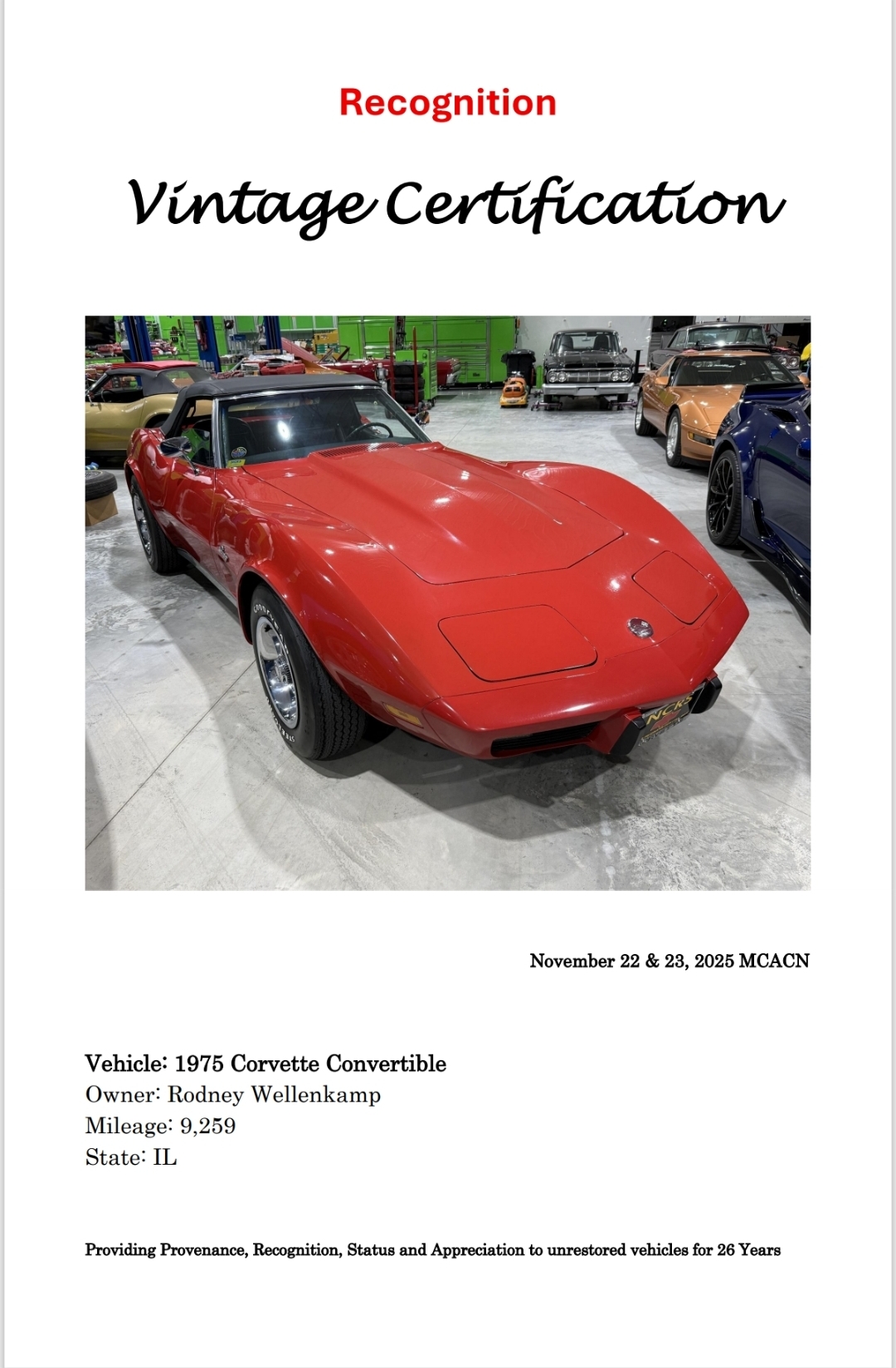 Vintage Certification™ is again proud and excited to be a part of the MCACN experience, hard to believe it's our 16th year at this show and 26th anniversary of Vintage Certification program. By now everyone should know this is a must attend event. Come Join Us and have your car Vintage Certified at MCACN Nov 22nd & 23rd in Chicago