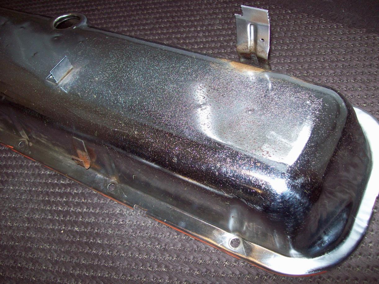 #1-Assembly line "FLASH" chrome valve covers. Perfect for a survivor or driver. Difficult to find drivers side cover has the correct welded tab for the temp switch wire and nothing missing. Passenger side has two of the three wire tabs for TCS wiring harnesses, the one facing intake at the front mounted area is missing but the rear one is there. See photos for exact condition which IMO is excellent over all but not perfect. (Photos are shown in this comment for #1 Pair)