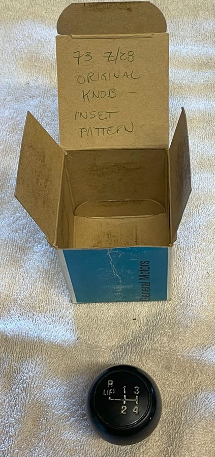 This was removed from my old all original '73 Z/28 back in the early 80's, so hopefully it is an assembly line correct part. The shift knob circle on top is roughly 1 3/16" diameter. I believe the later ones had a smaller size shift pattern I replaced it with the 357703 superseded knob (hence the box in the pics), which is the style that has the seam down the side. It's in good shape other than the faded numbers, which could be restored. Let's try $250 for this item (with free shipping to lower 48 states). PPF&F is preferred. Any questions, feel free to PM me.