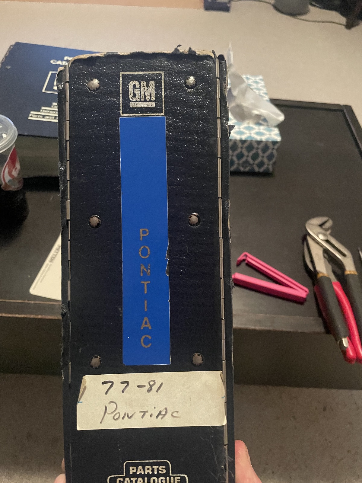 I hoped to get some assistance or opinions regarding the blue cloth bound cardboard binders used for Master Parts Catalogues (MPC's) and Service Bulletins (these were later replaced with same blue coloured hard plastic binders, then again later with red hard plastic binders). I love thumbing through MPC's - I realize the pitfalls of them (which in my opinion are few), but they give a glimpse to a point in the past, and I love to cross reference parts ect with them. I probably have about twelve of these (not including the white AC Delco three binder set I have); Most have (printed in silver ) a square GM logo printed on the top of the spine, and "PARTS CATALOGUE" on the bottom - they all have covers that I am confident I don't need to describe; I have several (which I am guessing to be later replacements) which have no printing of any kind - but are blank blue books. Most have some sort of identification sticker affixed to the spine in between the printing on the tops and bottom of the spine; I found one this past weekend which is far cooler than any of the ones I have previously bought; It has an indentation for the ID sticker to be slid into so that it's recessed in the spine - and it has metal edging everywhere. My issue which brings me to post today is that this "new" binder is missing the metal edging on the bottom of the rear cover, and (presumably) the bottom of the spine. This means that my rear cover is in really poor shape, and the spine is MUCH worse. QUESTION: Does anyone know how to fix any of these binders? Can you buy replacement edging for books which do not currently have it? Does anyone sell bang-on replacement decals for people like me who collect MPC's? I have attached a picture showing the spine of this "new" book; I swapped the original cover from this book to an unbranded book that had a slightly damaged front cover - it is on top of this binder. Thanks in advance to anyone who might offer any assistance. Jonathan EDIT: I have attached two additional images to show other identification stickers which remain on my books (others have imprint showing where the stickers were).