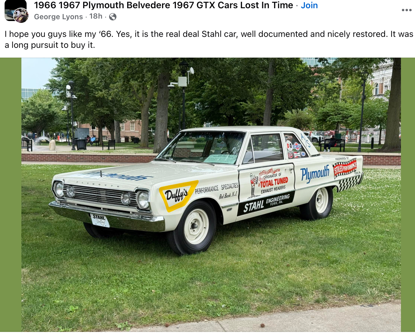 Looks like George Lyons secured one of the most successful Stock racers, Stahl’s ‘66 Hemi Belvedere that battled with Grumpy’s L79 Nova through 1966. Somewhere I have a magazine feature on this car in the early 80’s when it was found and restored to stock. They contacted Jere Stahl who verified it and still had the OEM exhaust hanging on the wall (which he sold to them).
