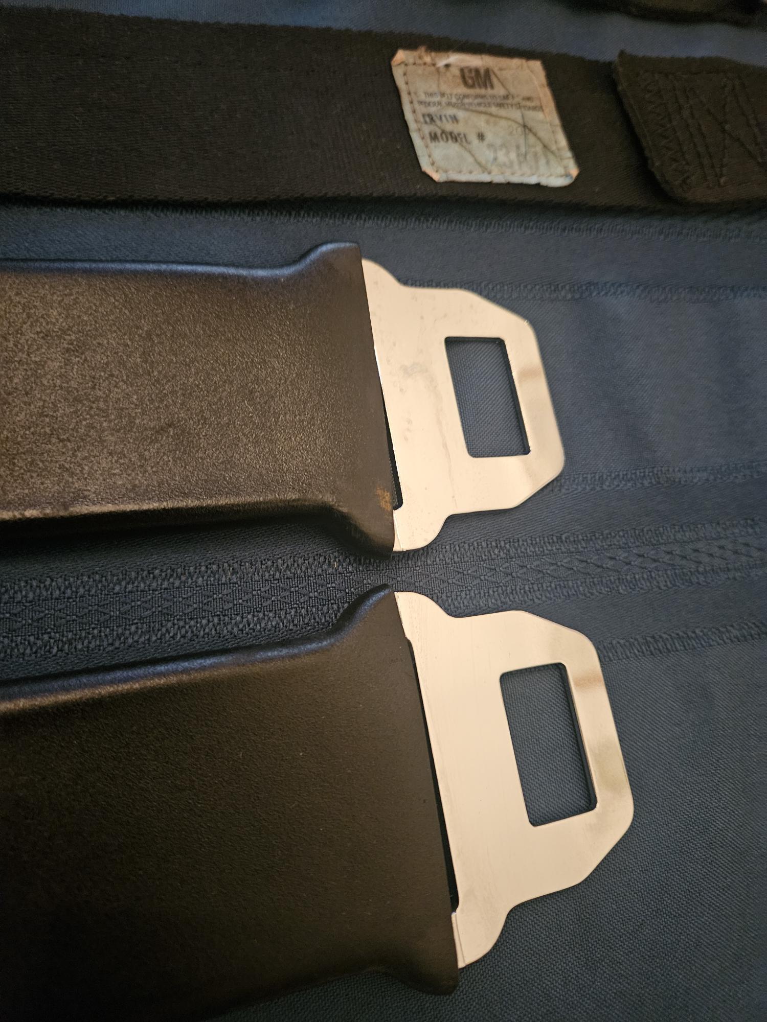 Very nice buckles and belts with minimal wear. Nice legible labels with 23rd and 35th to 37th week of 71 dates. Nothing like original belts for your Camaro. Mike Munro 518-526-3379 |